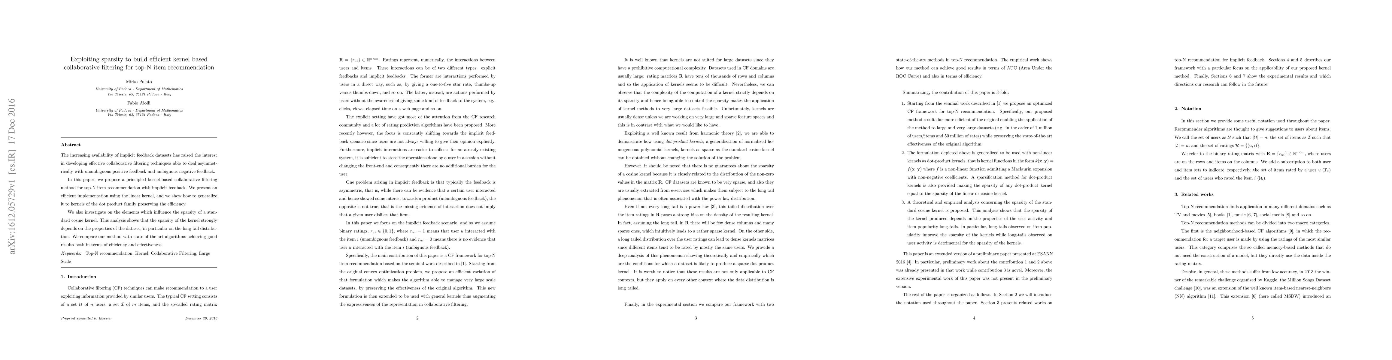 This paper proposes a kernel-based collaborative filtering method for top-N item recommendation using implicit feedback, leveraging sparsity for efficient computation. The method is shown to outperform state-of-the-art algorithms in terms of both efficiency and effectiveness.