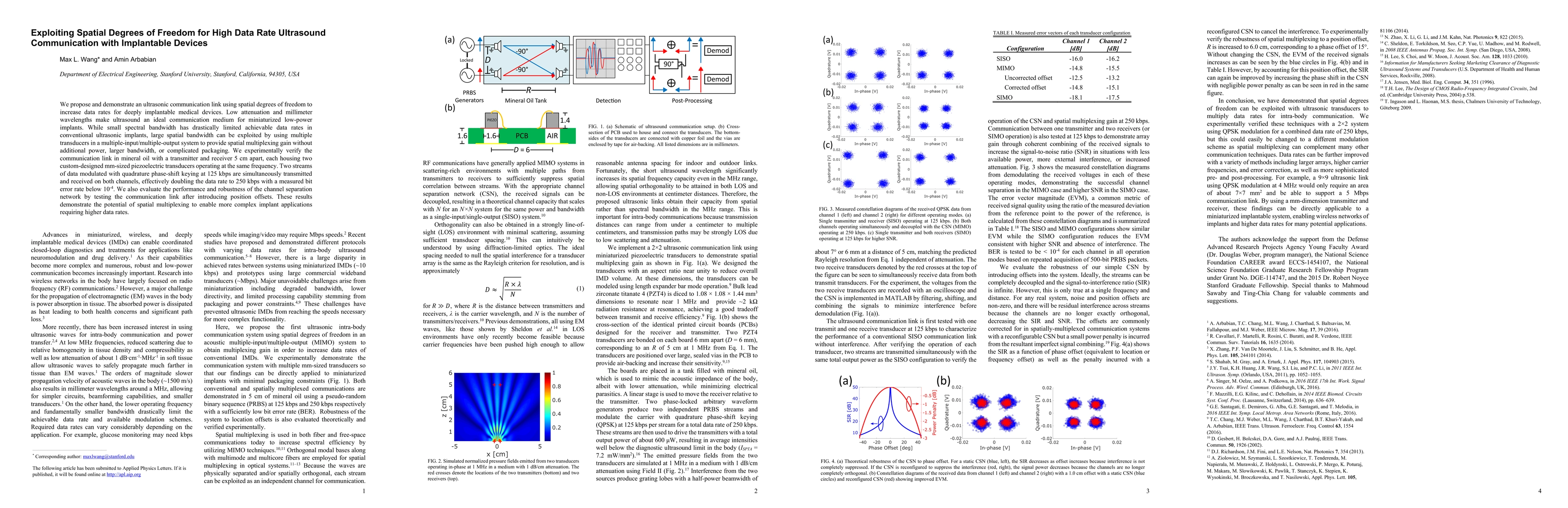 This paper proposes an ultrasonic communication link using spatial degrees of freedom to enhance data rates for implantable medical devices. The study demonstrates a spatial multiplexing technique using multiple transducers, doubling the data rate to 250 kbps without additional power or bandwidth, and showing robustness against position offsets.