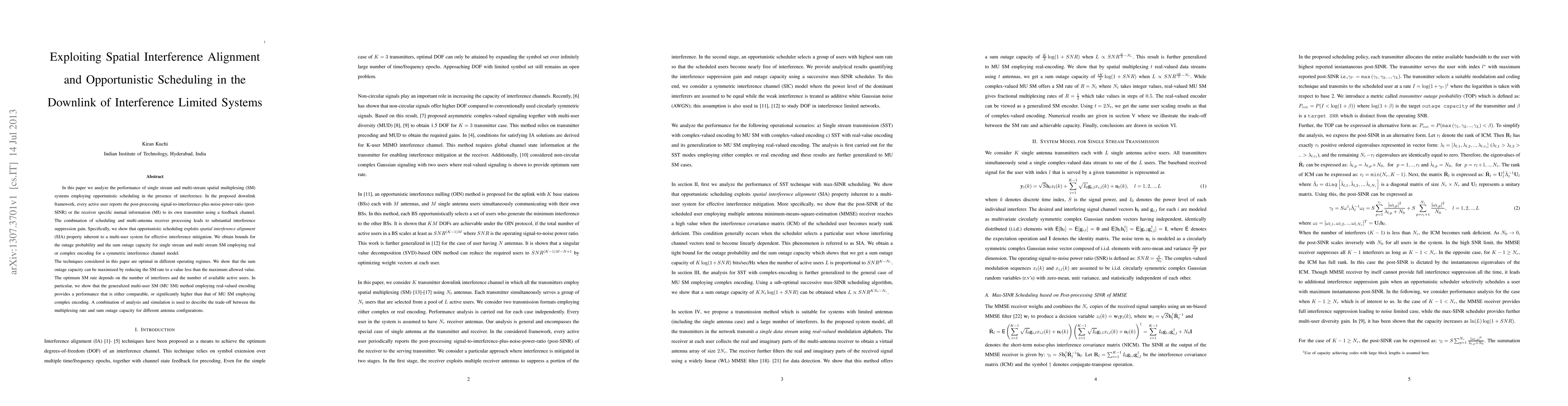 In this paper we analyze the performance of single stream and multi-stream spatial multiplexing (SM) systems employing opportunistic scheduling in the presence of interference. In the proposed downlink framework, every active user reports the post-processing signal-to-interference-plus-noise-power-ratio (post-SINR) or the receiver specific mutual information (MI) to its own transmitter using a feedback channel. The combination of scheduling and multi-antenna receiver processing leads to substantial interference suppression gain. Specifically, we show that opportunistic scheduling exploits spatial interference alignment (SIA) property inherent to a multi-user system for effective interference mitigation. We obtain bounds for the outage probability and the sum outage capacity for single stream and multi stream SM employing real or complex encoding for a symmetric interference channel model. The techniques considered in this paper are optimal in different operating regimes. We show that the sum outage capacity can be maximized by reducing the SM rate to a value less than the maximum allowed value. The optimum SM rate depends on the number of interferers and the number of available active users. In particular, we show that the generalized multi-user SM (MU SM) method employing real-valued encoding provides a performance that is either comparable, or significantly higher than that of MU SM employing complex encoding. A combination of analysis and simulation is used to describe the trade-off between the multiplexing rate and sum outage capacity for different antenna configurations.