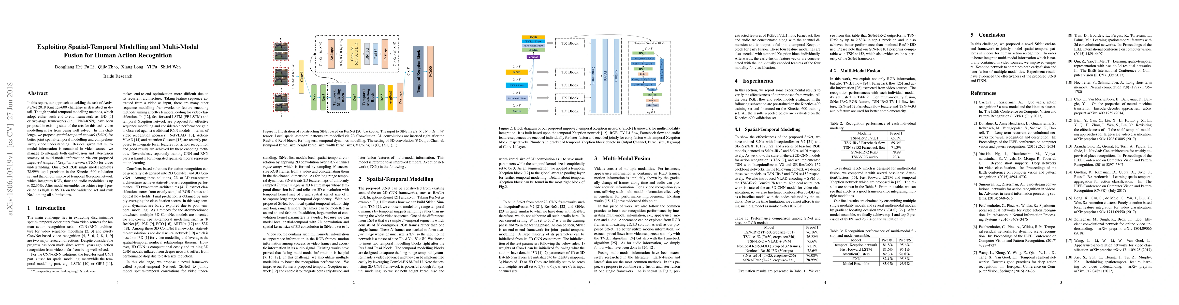 This paper proposes a spatial-temporal network (StNet) for enhanced human action recognition, achieving 78.99% top-1 precision with RGB input. It further integrates multi-modal data using an improved temporal Xception network (iTXN) to reach 82.35% precision, ultimately achieving 85.0% top-1 precision through model ensemble, ranking first in the ActivityNet 2018 Kinetics-600 challenge.