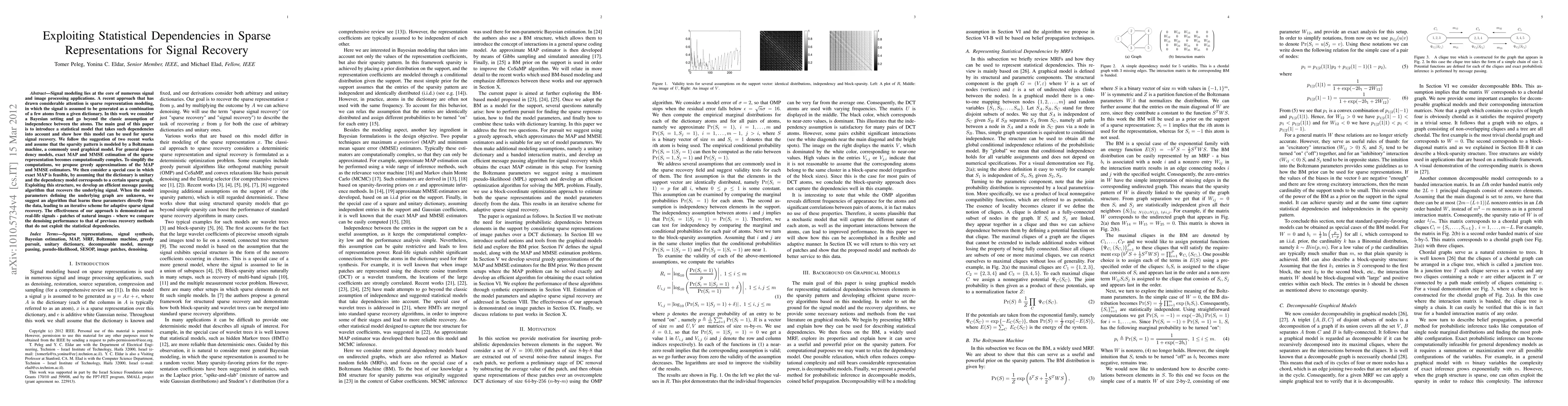 This paper introduces a Bayesian model for sparse signal recovery that accounts for statistical dependencies between atoms in a dictionary, using a Boltzmann machine to model the sparsity pattern. It proposes efficient approximations and an adaptive algorithm for parameter learning, demonstrating improved denoising performance on natural image patches.
