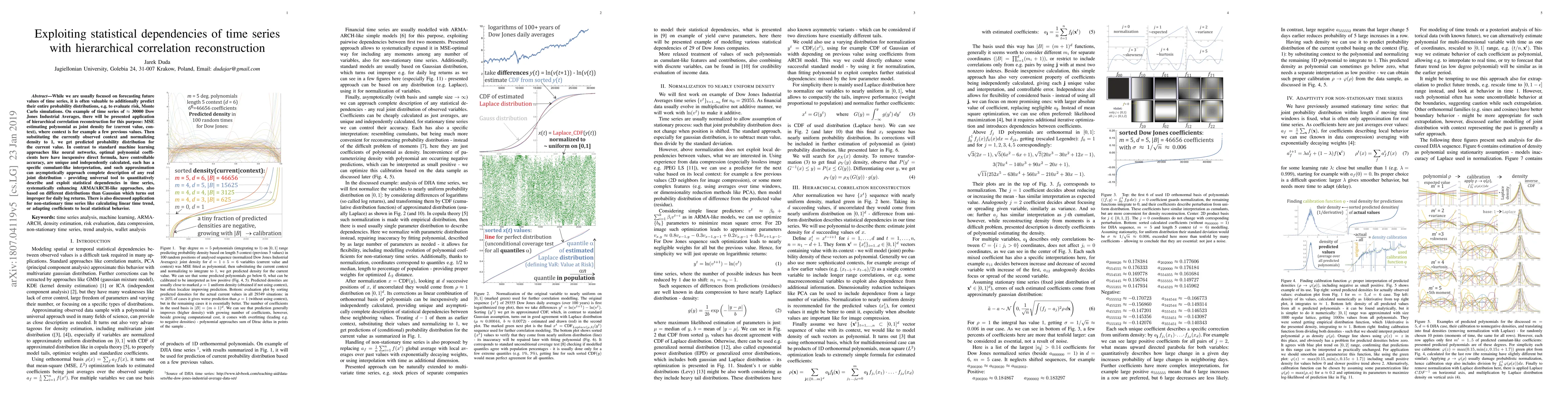 While we are usually focused on forecasting future values of time series, it is often valuable to additionally predict their entire probability distributions, e.g. to evaluate risk, Monte Carlo simulations. On example of time series of $\approx$ 30000 Dow Jones Industrial Averages, there will be presented application of hierarchical correlation reconstruction for this purpose: MSE estimating polynomial as joint density for (current value, context), where context is for example a few previous values. Then substituting the currently observed context and normalizing density to 1, we get predicted probability distribution for the current value. In contrast to standard machine learning approaches like neural networks, optimal polynomial coefficients here have inexpensive direct formula, have controllable accuracy, are unique and independently calculated, each has a specific cumulant-like interpretation, and such approximation can asymptotically approach complete description of any real joint distribution - providing universal tool to quantitatively describe and exploit statistical dependencies in time series, systematically enhancing ARMA/ARCH-like approaches, also based on different distributions than Gaussian which turns out improper for daily log returns. There is also discussed application for non-stationary time series like calculating linear time trend, or adapting coefficients to local statistical behavior.
