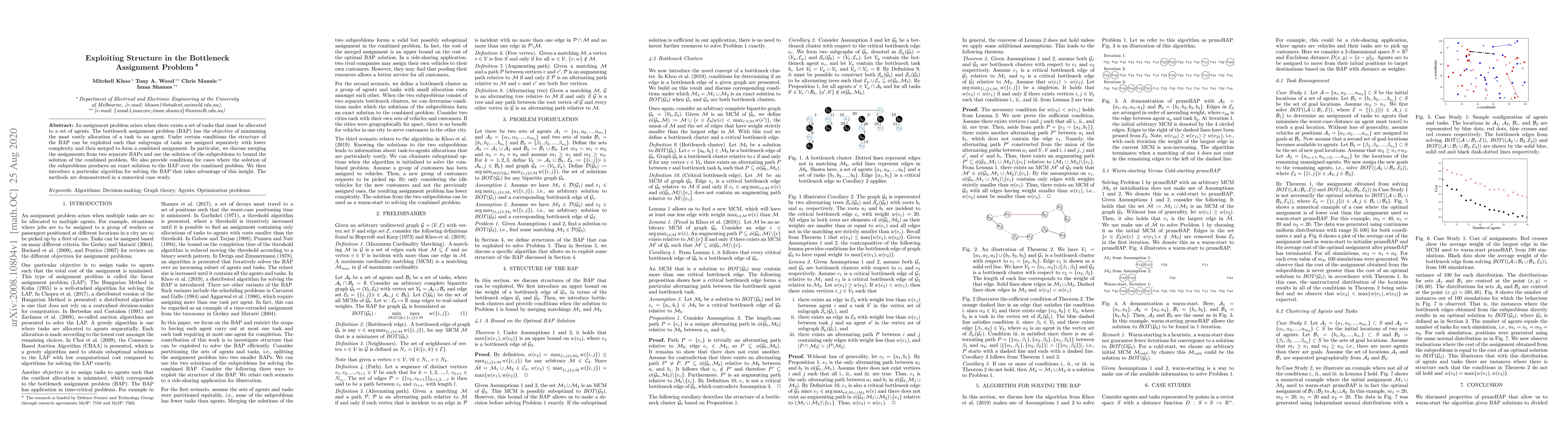 This paper explores exploiting structural properties in the bottleneck assignment problem (BAP) to reduce complexity. It proposes a method to solve subgroups separately and merge their solutions, providing conditions for exact solutions and introducing an algorithm for efficient BAP resolution, validated through a numerical case study.