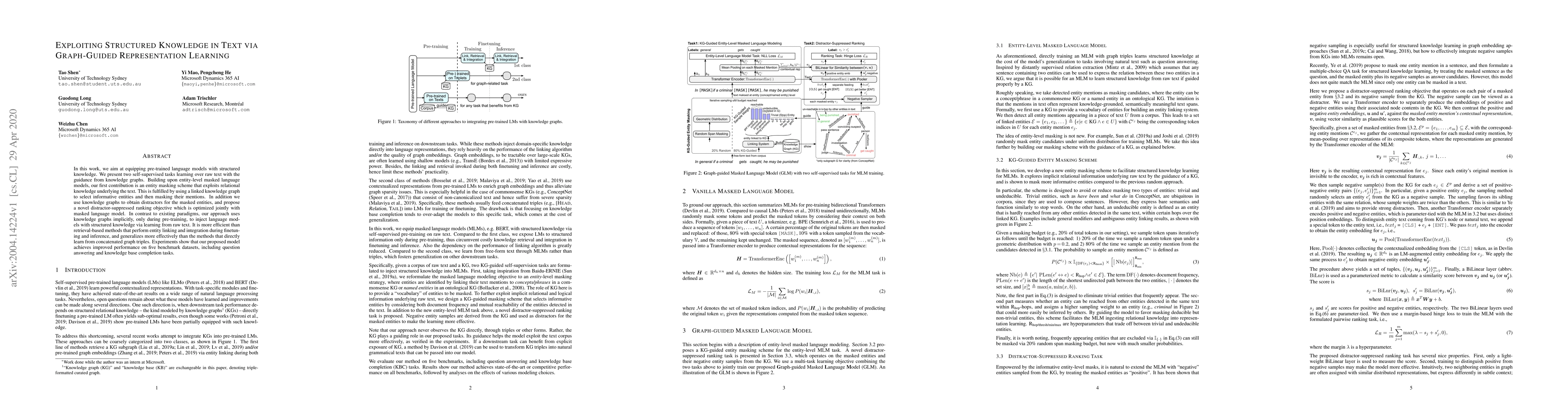 This paper introduces a method to enhance pre-trained language models by incorporating structured knowledge from knowledge graphs through self-supervised learning tasks. The approach uses an entity masking scheme guided by knowledge graphs to improve the model's understanding and performance on various tasks, demonstrating better results on benchmark datasets compared to existing methods.