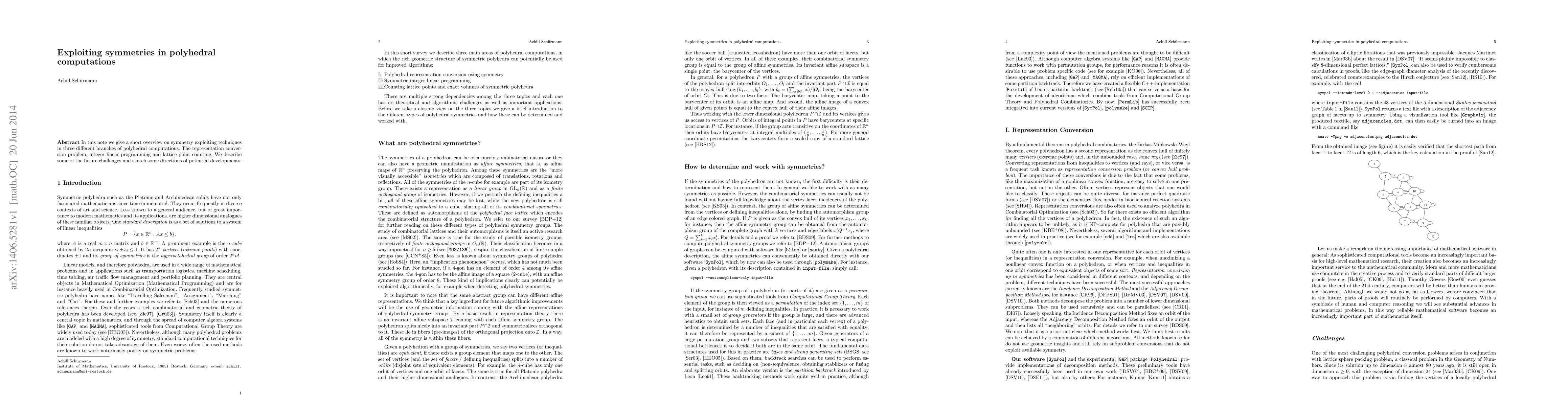 This paper explores ways to improve polyhedral computations by exploiting symmetries, with applications in integer linear programming and lattice point counting, and discusses future challenges and potential developments.