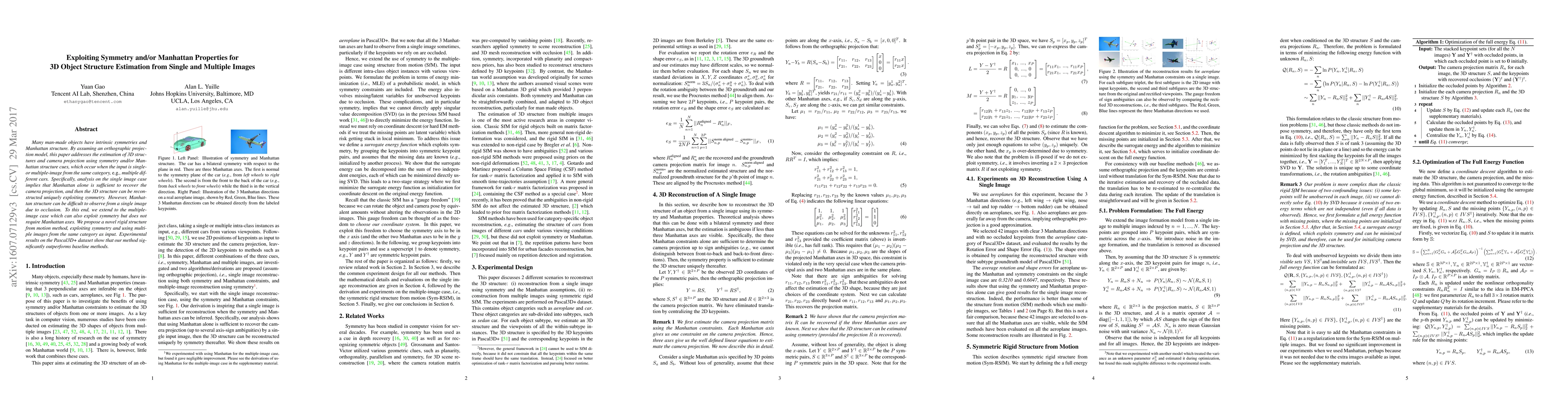 Many man-made objects have intrinsic symmetries and Manhattan structure. By assuming an orthographic projection model, this paper addresses the estimation of 3D structures and camera projection using symmetry and/or Manhattan structure cues, which occur when the input is single- or multiple-image from the same category, e.g., multiple different cars. Specifically, analysis on the single image case implies that Manhattan alone is sufficient to recover the camera projection, and then the 3D structure can be reconstructed uniquely exploiting symmetry. However, Manhattan structure can be difficult to observe from a single image due to occlusion. To this end, we extend to the multiple-image case which can also exploit symmetry but does not require Manhattan axes. We propose a novel rigid structure from motion method, exploiting symmetry and using multiple images from the same category as input. Experimental results on the Pascal3D+ dataset show that our method significantly outperforms baseline methods.
