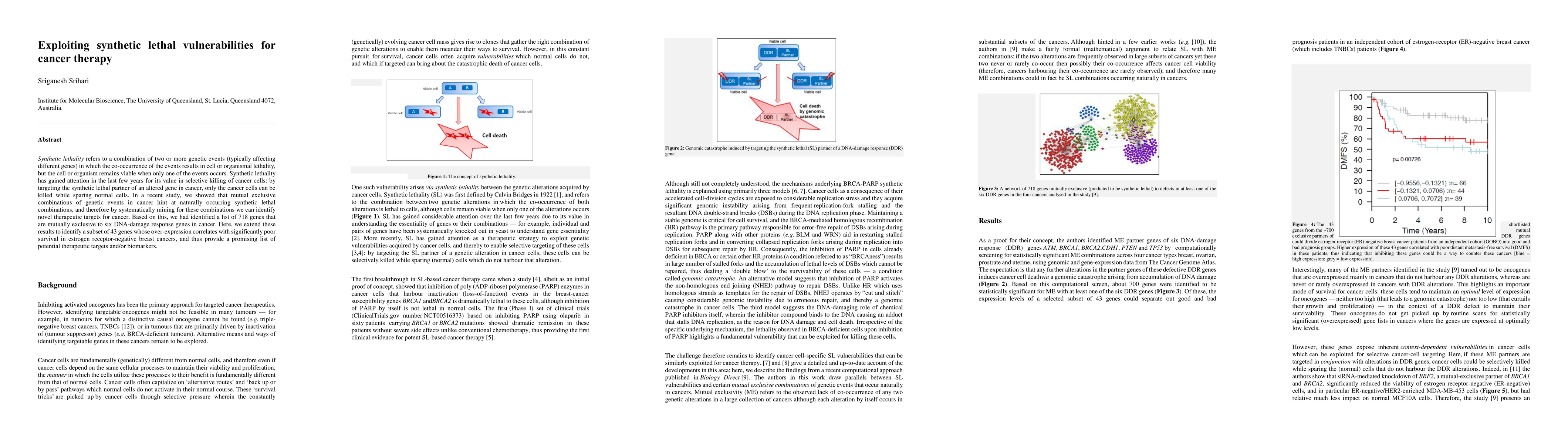 Synthetic lethality refers to a combination of two or more genetic events (typically affecting different genes) in which the co-occurrence of the events results in cell or organismal lethality, but the cell or organism remains viable when only one of the events occurs. Synthetic lethality has gained attention in the last few years for its value in selective killing of cancer cells: by targeting the synthetic lethal partner of an altered gene in cancer, only the cancer cells can be killed while sparing normal cells. In a recent study, we showed that mutual exclusive combinations of genetic events in cancer hint at naturally occurring synthetic lethal combinations, and therefore by systematically mining for these combinations we can identify novel therapeutic targets for cancer. Based on this, we had identified a list of 718 genes that are mutually exclusive to six DNA-damage response genes in cancer. Here, we extend these results to identify a subset of 43 genes whose over-expression correlates with significantly poor survival in estrogen receptor-negative breast cancers, and thus provide a promising list of potential therapeutic targets and/or biomarkers.