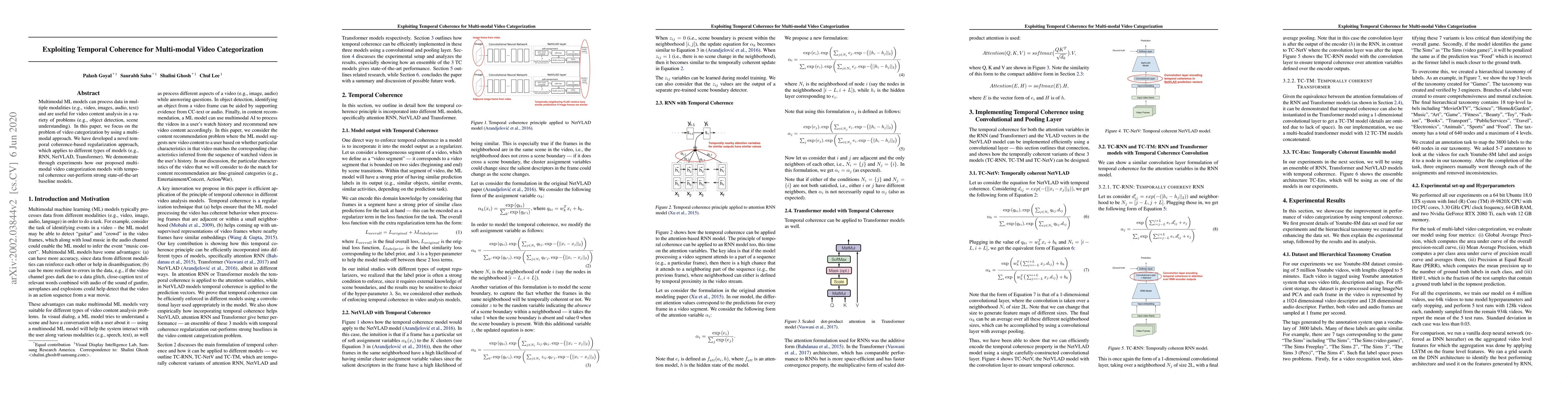 Multimodal ML models can process data in multiple modalities (e.g., video, images, audio, text) and are useful for video content analysis in a variety of problems (e.g., object detection, scene understanding). In this paper, we focus on the problem of video categorization by using a multimodal approach. We have developed a novel temporal coherence-based regularization approach, which applies to different types of models (e.g., RNN, NetVLAD, Transformer). We demonstrate through experiments how our proposed multimodal video categorization models with temporal coherence out-perform strong state-of-the-art baseline models.