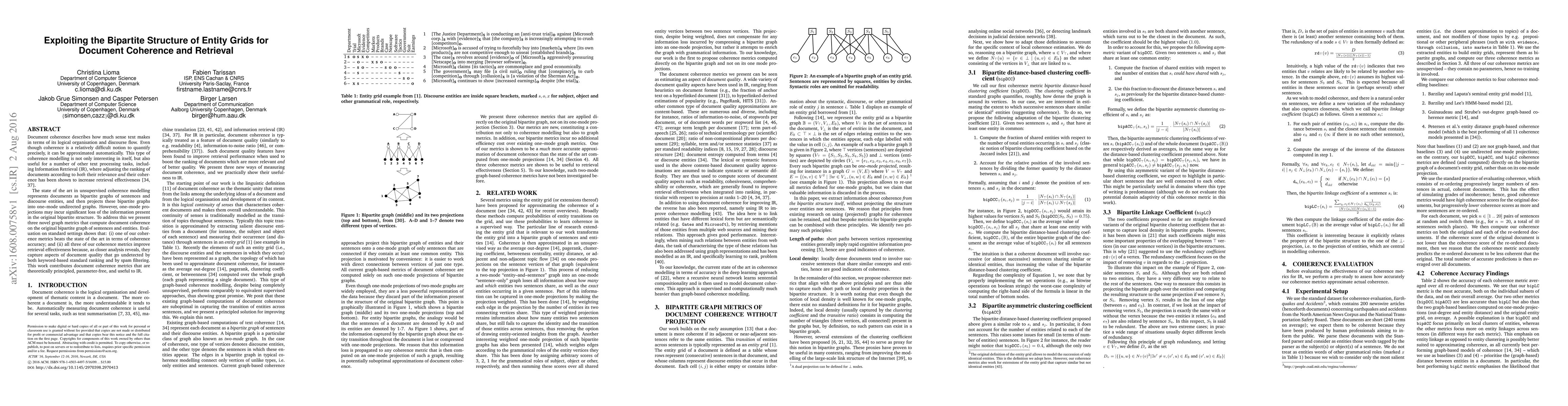 This paper introduces three novel graph metrics to model document coherence by exploiting the bipartite structure of sentences and discourse entities, rather than losing information through one-mode projection. The proposed metrics show superior coherence accuracy and enhance information retrieval effectiveness by capturing document quality aspects overlooked by traditional methods.
