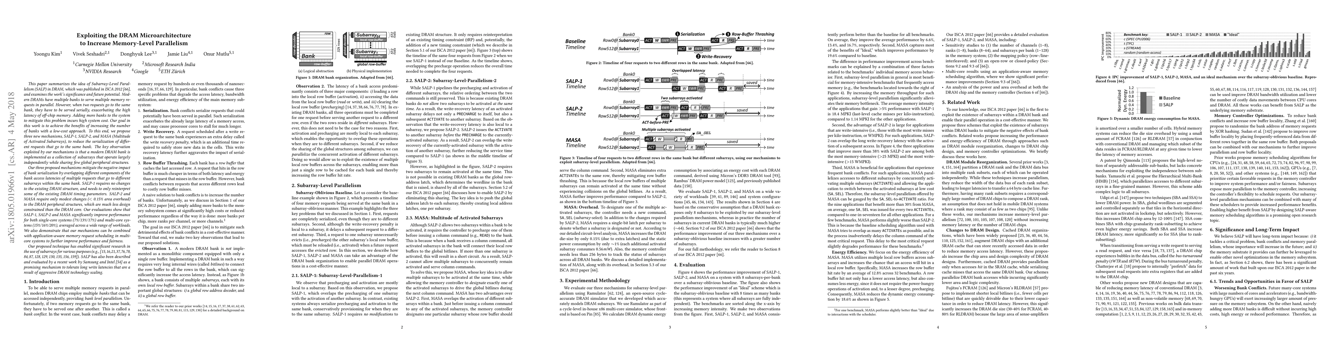 This paper proposes three low-cost mechanisms—SALP-1, SALP-2, and MASA—to enhance memory-level parallelism in DRAM by reducing serialization of requests to the same bank. These mechanisms exploit the independent operation of DRAM subarrays to overlap access latencies, achieving significant performance improvements in both single-core and multi-core systems with minimal area overhead.