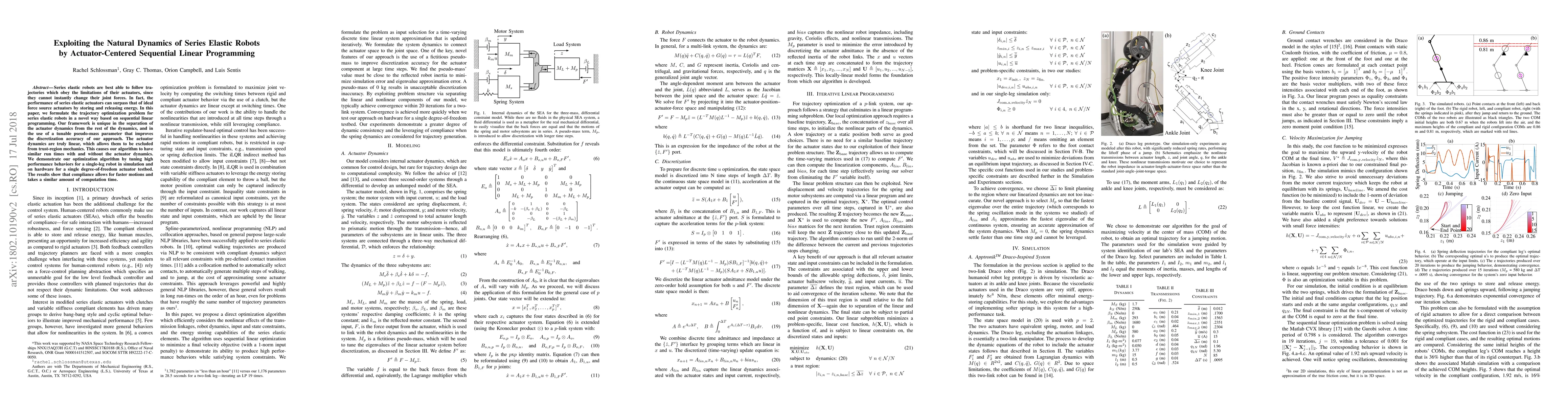 The paper proposes a novel trajectory optimization method for series elastic robots using sequential linear programming, separating actuator dynamics from the rest of the system and employing a tunable pseudo-mass parameter for improved discretization accuracy.