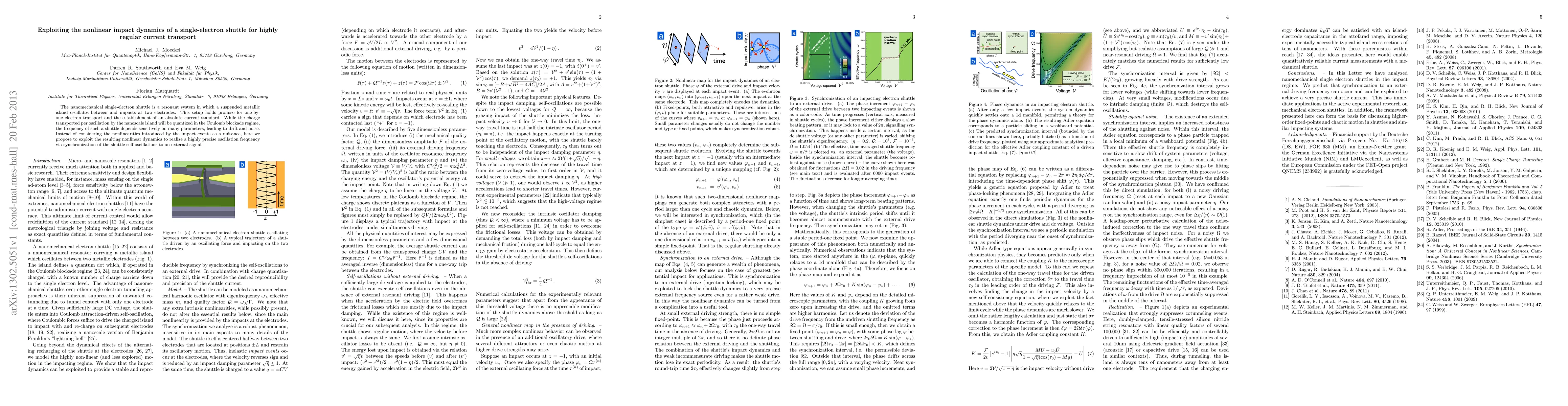 This paper explores the nonlinear dynamics of a single-electron shuttle, proposing to harness its impact-induced nonlinearities to achieve highly precise oscillation frequency through synchronization with an external signal, aiming for a stable current standard.