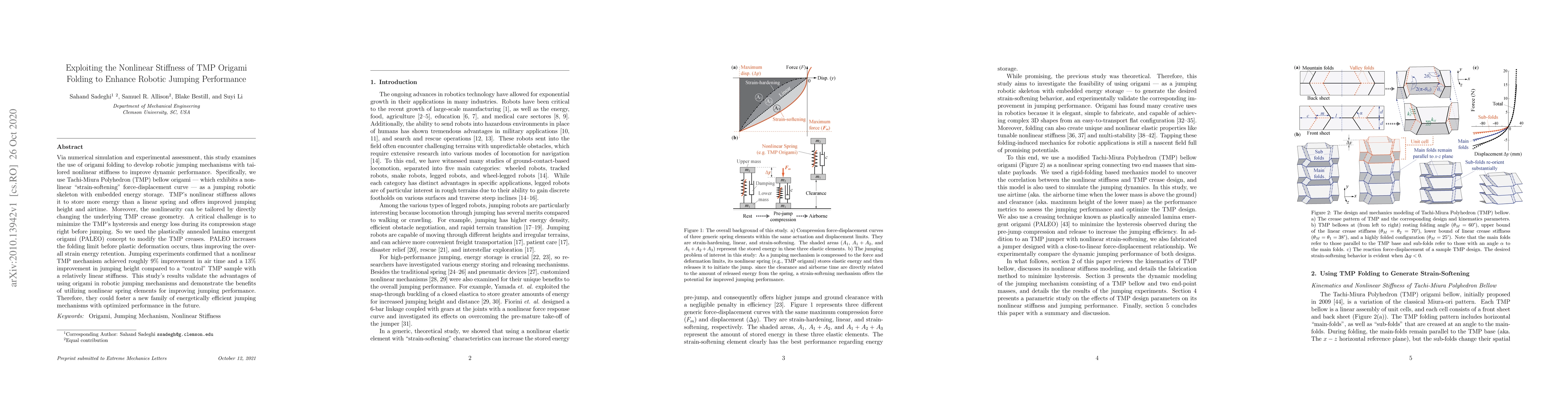 This study explores using TMP origami folding to enhance robotic jumping performance by leveraging its nonlinear stiffness for better energy storage and dynamic capabilities. The research shows that TMP origami can achieve up to 13% higher jumping height and 9% longer airtime compared to linear spring mechanisms, demonstrating the potential for more efficient jumping robots.