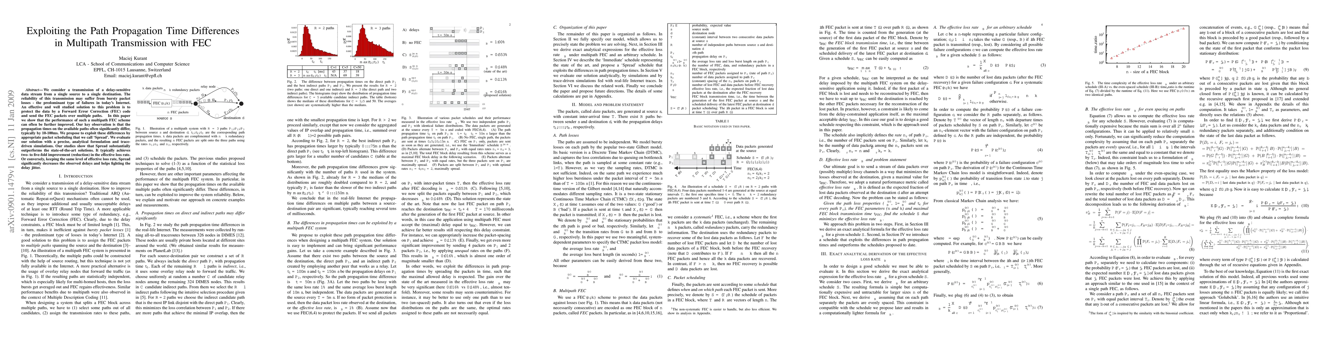 This paper proposes a new method called 'Spread' to enhance multipath FEC (Forward Error Correction) transmission reliability by exploiting differences in path propagation times, typically 10-100ms. Evaluations via analytical models and simulations show 'Spread' can achieve two- to five-fold improvement in effective loss rate reduction and significant decrease in observed delays and delay jitter.