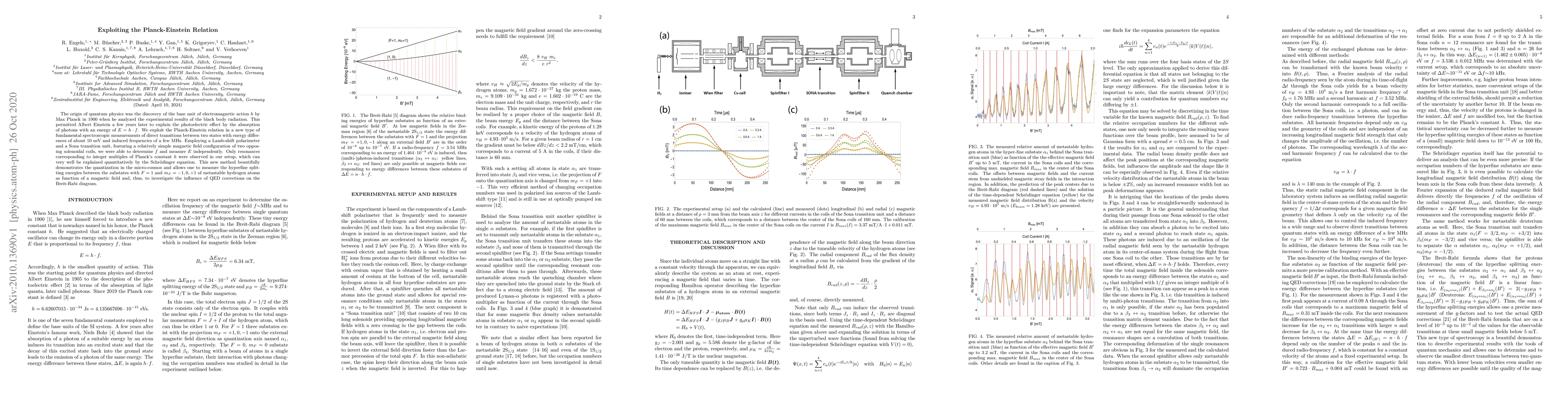 The origin of quantum physics was the discovery of the base unit of electromagnetic action $h$ by Max Planck in 1900 when he analyzed the experimental results of the black body radiation. This permitted Albert Einstein a few years later to explain the photoelectric effect by the absorption of photons with an energy of $E = h \cdot f$. We exploit the Planck-Einstein relation in a new type of fundamental spectroscopic measurements of direct transitions between two states with energy differences of about 10 neV and induced frequencies of a few MHz. Employing a Lamb-shift polarimeter and a Sona transition unit, featuring a relatively simple magnetic field configuration of two opposing solenoidal coils, we were able to determine $f$ and measure $E$ independently. Only resonances corresponding to integer multiples of Planck's constant $h$ were observed in our setup, which can very well be explained quantitatively by the Schr\"odinger equation. This new method beautifully demonstrates the quantization in the micro-cosmos and allows one to measure the hyperfine splitting energies between the substates with $F=1$ and $m_F = -1, 0, +1$ of metastable hydrogen atoms as function of a magnetic field and, thus, to investigate the influence of QED corrections on the Breit-Rabi diagram.