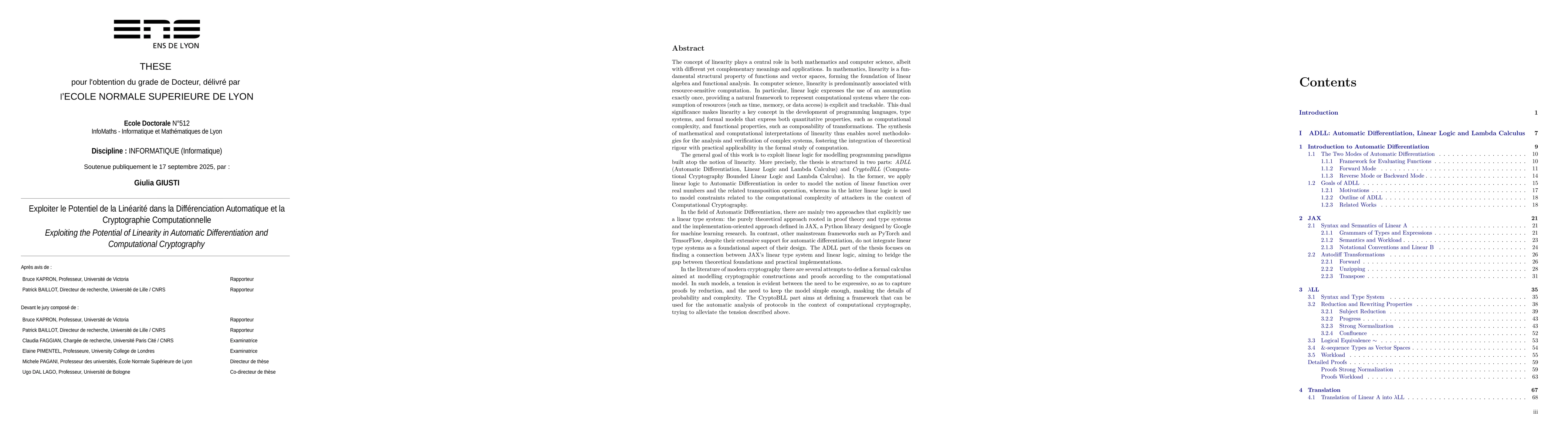 The concept of linearity plays a central role in both mathematics and computer science, with distinct yet complementary meanings. In mathematics, linearity underpins functions and vector spaces, forming the foundation of linear algebra and functional analysis. In computer science, it relates to resource-sensitive computation. Linear Logic (LL), for instance, models assumptions that must be used exactly once, providing a natural framework for tracking computational resources such as time, memory, or data access. This dual perspective makes linearity essential to programming languages, type systems, and formal models that express both computational complexity and composability. Bridging these interpretations enables rigorous yet practical methodologies for analyzing and verifying complex systems. This thesis explores the use of LL to model programming paradigms based on linearity. It comprises two parts: ADLL and CryptoBLL. The former applies LL to Automatic Differentiation (AD), modeling linear functions over the reals and the transposition operation. The latter uses LL to express complexity constraints on adversaries in computational cryptography. In AD, two main approaches use linear type systems: a theoretical one grounded in proof theory, and a practical one implemented in JAX, a Python library developed by Google for machine learning research. In contrast, frameworks like PyTorch and TensorFlow support AD without linear types. ADLL aims to bridge theory and practice by connecting JAX's type system to LL. In modern cryptography, several calculi aim to model cryptographic proofs within the computational paradigm. These efforts face a trade-off between expressiveness, to capture reductions, and simplicity, to abstract probability and complexity. CryptoBLL addresses this tension by proposing a framework for the automatic analysis of protocols in computational cryptography.