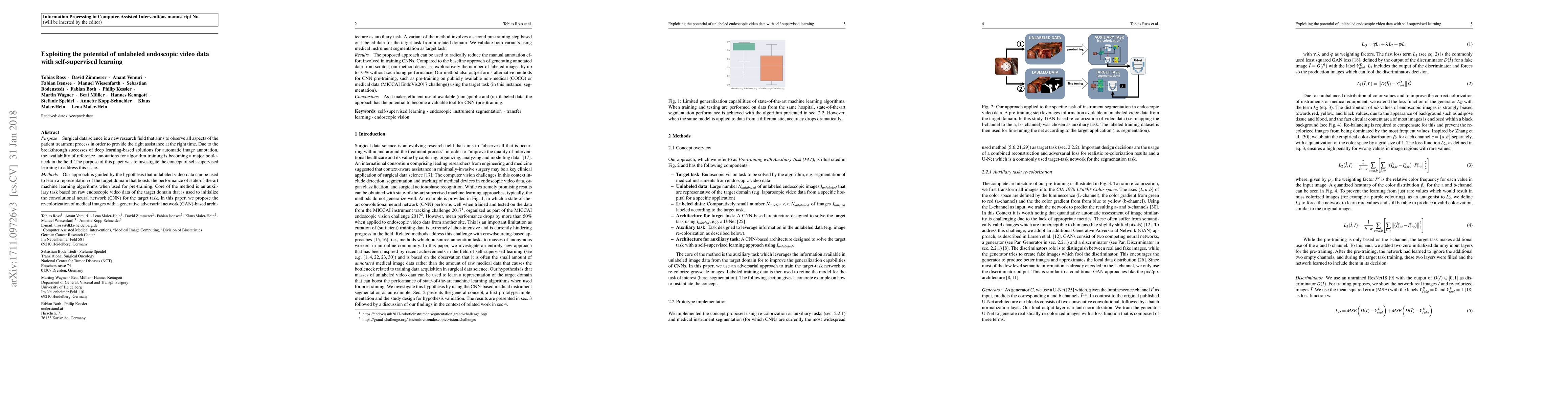 Surgical data science is a new research field that aims to observe all aspects of the patient treatment process in order to provide the right assistance at the right time. Due to the breakthrough successes of deep learning-based solutions for automatic image annotation, the availability of reference annotations for algorithm training is becoming a major bottleneck in the field. The purpose of this paper was to investigate the concept of self-supervised learning to address this issue. Our approach is guided by the hypothesis that unlabeled video data can be used to learn a representation of the target domain that boosts the performance of state-of-the-art machine learning algorithms when used for pre-training. Core of the method is an auxiliary task based on raw endoscopic video data of the target domain that is used to initialize the convolutional neural network (CNN) for the target task. In this paper, we propose the re-colorization of medical images with a generative adversarial network (GAN)-based architecture as auxiliary task. A variant of the method involves a second pre-training step based on labeled data for the target task from a related domain. We validate both variants using medical instrument segmentation as target task. The proposed approach can be used to radically reduce the manual annotation effort involved in training CNNs. Compared to the baseline approach of generating annotated data from scratch, our method decreases exploratively the number of labeled images by up to 75% without sacrificing performance. Our method also outperforms alternative methods for CNN pre-training, such as pre-training on publicly available non-medical or medical data using the target task (in this instance: segmentation). As it makes efficient use of available (non-)public and (un-)labeled data, the approach has the potential to become a valuable tool for CNN (pre-)training.