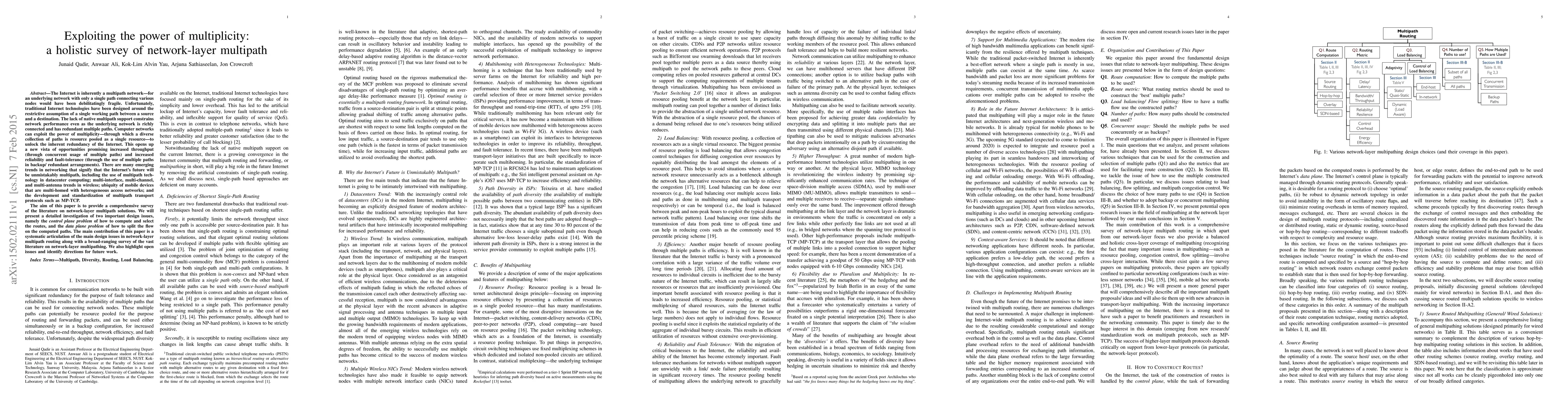 The Internet is inherently a multipath network---for an underlying network with only a single path connecting various nodes would have been debilitatingly fragile. Unfortunately, traditional Internet technologies have been designed around the restrictive assumption of a single working path between a source and a destination. The lack of native multipath support constrains network performance even as the underlying network is richly connected and has redundant multiple paths. Computer networks can exploit the power of multiplicity to unlock the inherent redundancy of the Internet. This opens up a new vista of opportunities promising increased throughput (through concurrent usage of multiple paths) and increased reliability and fault-tolerance (through the use of multiple paths in backup/ redundant arrangements). There are many emerging trends in networking that signify that the Internet's future will be unmistakably multipath, including the use of multipath technology in datacenter computing; multi-interface, multi-channel, and multi-antenna trends in wireless; ubiquity of mobile devices that are multi-homed with heterogeneous access networks; and the development and standardization of multipath transport protocols such as MP-TCP. The aim of this paper is to provide a comprehensive survey of the literature on network-layer multipath solutions. We will present a detailed investigation of two important design issues, namely the control plane problem of how to compute and select the routes, and the data plane problem of how to split the flow on the computed paths. The main contribution of this paper is a systematic articulation of the main design issues in network-layer multipath routing along with a broad-ranging survey of the vast literature on network-layer multipathing. We also highlight open issues and identify directions for future work.