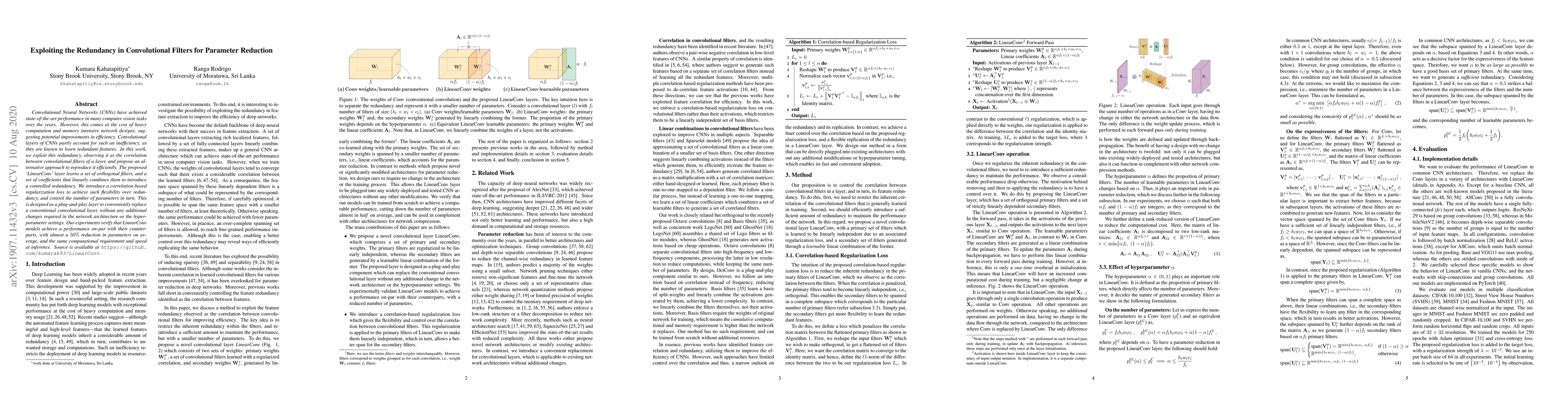 This paper proposes a 'LinearConv' layer to exploit redundancy in convolutional filters, reducing parameters by 50% on average while maintaining performance, computational efficiency, and speed. The approach introduces a correlation-based regularization loss to manage filter redundancy and can replace conventional convolutional layers without altering network architecture or hyperparameters.
