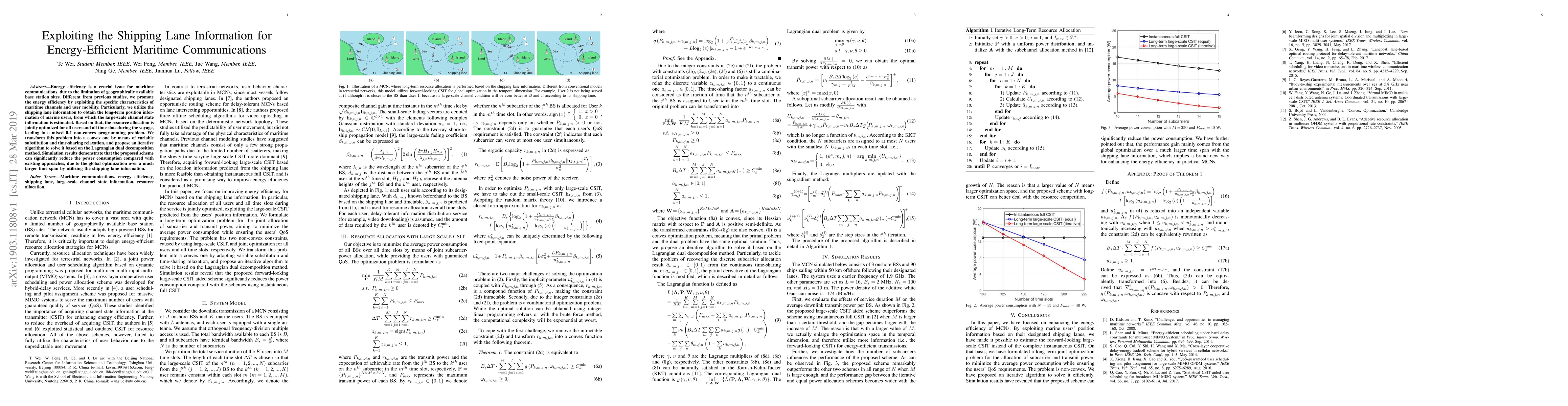 Energy efficiency is a crucial issue for maritime communications, due to the limitation of geographically available base station sites. Different from previous studies, we promote the energy efficiency by exploiting the specific characteristics of maritime channels and user mobility. Particularly, we utilize the shipping lane information to obtain the long-term position information of marine users, from which the large-scale channel state information is estimated. Based on that, the resource allocation is jointly optimized for all users and all time slots during the voyage, leading to a mixed 0-1 non-convex programming problem. We transform this problem into a convex one by means of variable substitution and time-sharing relaxation, and propose an iterative algorithm to solve it based on the Lagrangian dual decomposition method. Simulation results demonstrate that the proposed scheme can significantly reduce the power consumption compared with existing approaches, due to the global optimization over a much larger time span by utilizing the shipping lane information.