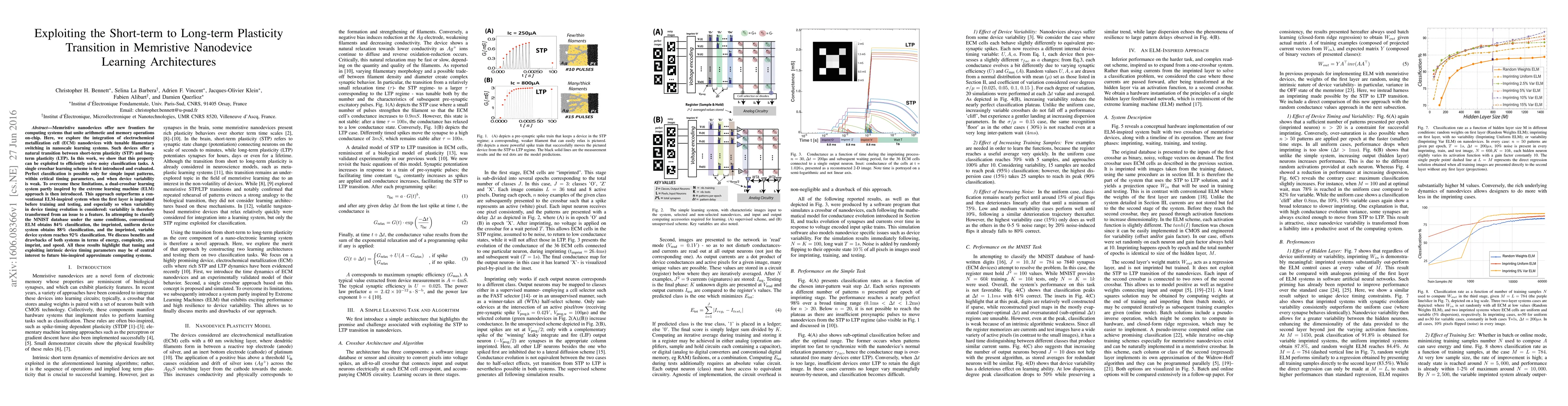 Memristive nanodevices offer new frontiers for computing systems that unite arithmetic and memory operations on-chip. Here, we explore the integration of electrochemical metallization cell (ECM) nanodevices with tunable filamentary switching in nanoscale learning systems. Such devices offer a natural transition between short-term plasticity (STP) and long-term plasticity (LTP). In this work, we show that this property can be exploited to efficiently solve noisy classification tasks. A single crossbar learning scheme is first introduced and evaluated. Perfect classification is possible only for simple input patterns, within critical timing parameters, and when device variability is weak. To overcome these limitations, a dual-crossbar learning system partly inspired by the extreme learning machine (ELM) approach is then introduced. This approach outperforms a conventional ELM-inspired system when the first layer is imprinted before training and testing, and especially so when variability in device timing evolution is considered: variability is therefore transformed from an issue to a feature. In attempting to classify the MNIST database under the same conditions, conventional ELM obtains 84% classification, the imprinted, uniform device system obtains 88% classification, and the imprinted, variable device system reaches 92% classification. We discuss benefits and drawbacks of both systems in terms of energy, complexity, area imprint, and speed. All these results highlight that tuning and exploiting intrinsic device timing parameters may be of central interest to future bio-inspired approximate computing systems.