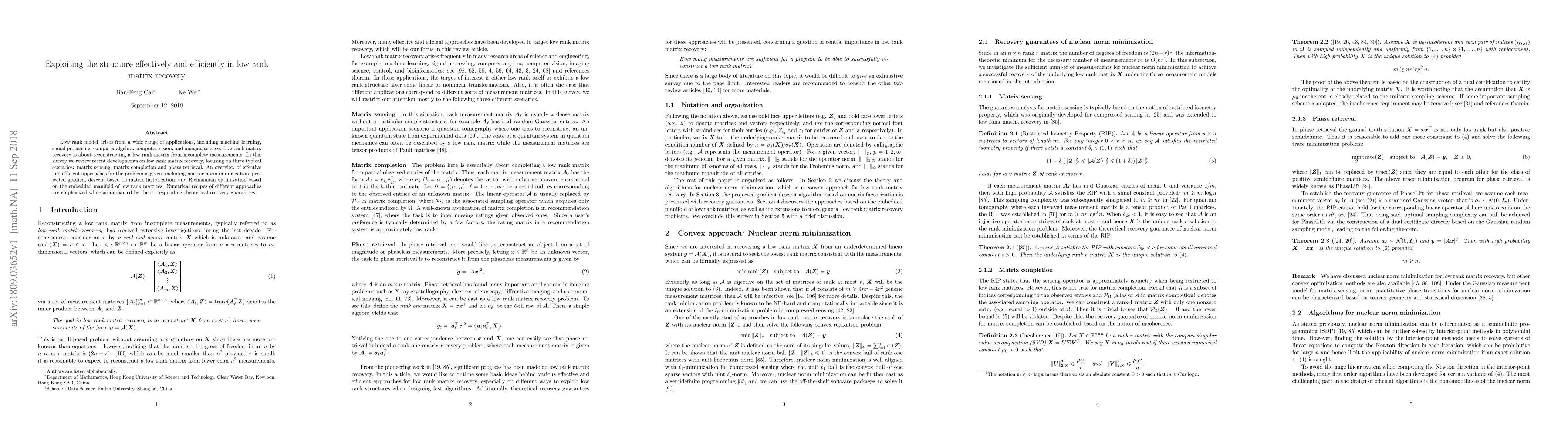 Low rank model arises from a wide range of applications, including machine learning, signal processing, computer algebra, computer vision, and imaging science. Low rank matrix recovery is about reconstructing a low rank matrix from incomplete measurements. In this survey we review recent developments on low rank matrix recovery, focusing on three typical scenarios: matrix sensing, matrix completion and phase retrieval. An overview of effective and efficient approaches for the problem is given, including nuclear norm minimization, projected gradient descent based on matrix factorization, and Riemannian optimization based on the embedded manifold of low rank matrices. Numerical recipes of different approaches are emphasized while accompanied by the corresponding theoretical recovery guarantees.