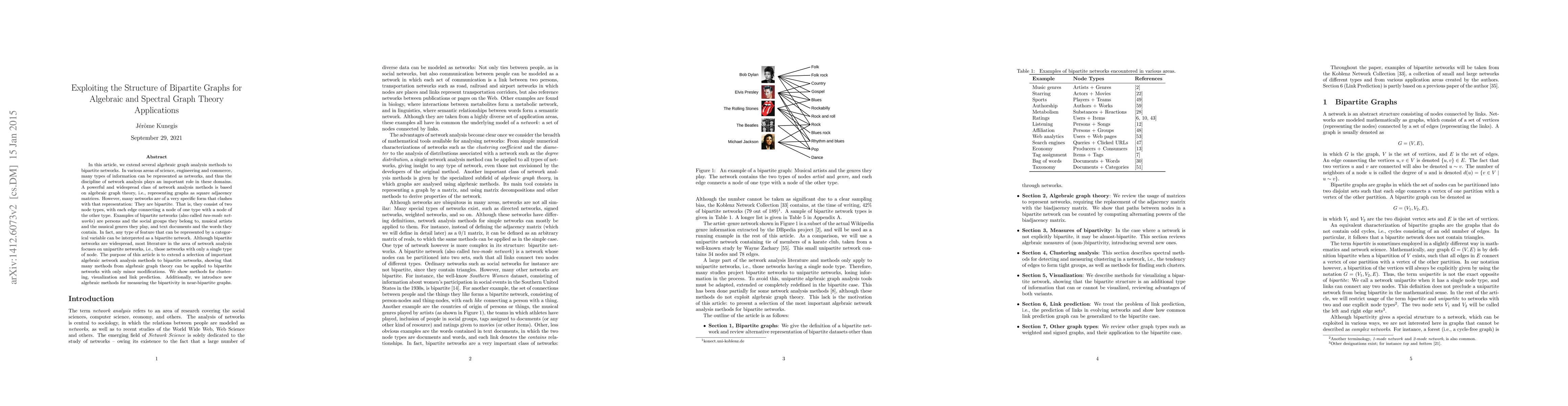 This paper extends algebraic graph analysis methods to bipartite networks, demonstrating how traditional unipartite network analysis techniques can be adapted for bipartite structures. It introduces new methods for clustering, visualization, link prediction, and bipartivity measurement in near-bipartite graphs.