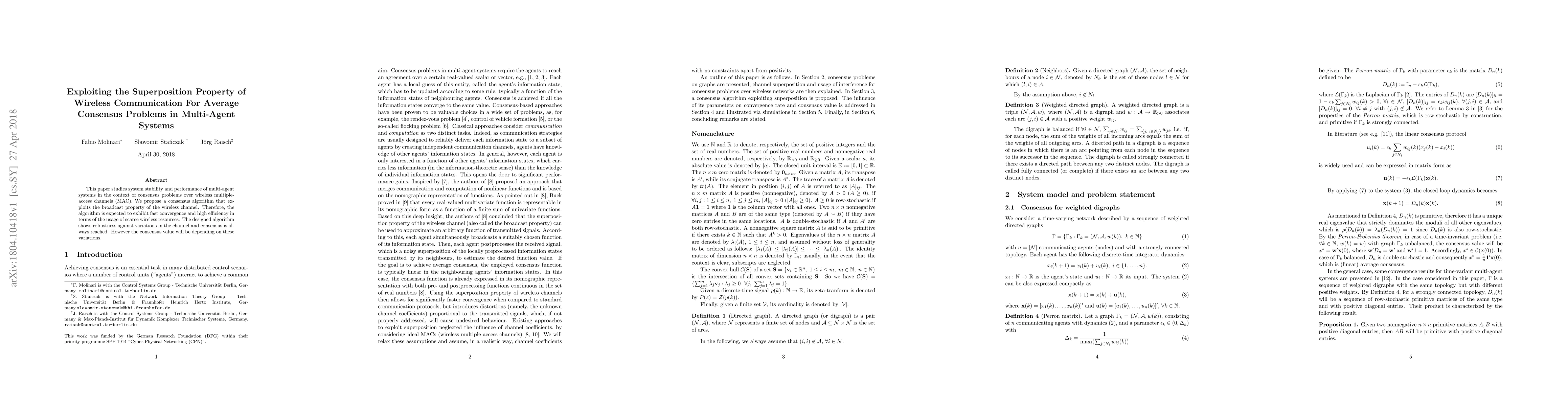 This paper studies system stability and performance of multi-agent systems in the context of consensus problems over wireless multiple-access channels (MAC). We propose a consensus algorithm that exploits the broadcast property of the wireless channel. Therefore, the algorithm is expected to exhibit fast convergence and high efficiency in terms of the usage of scarce wireless resources. The designed algorithm shows robustness against variations in the channel and consensus is always reached. However the consensus value will be depending on these variations.