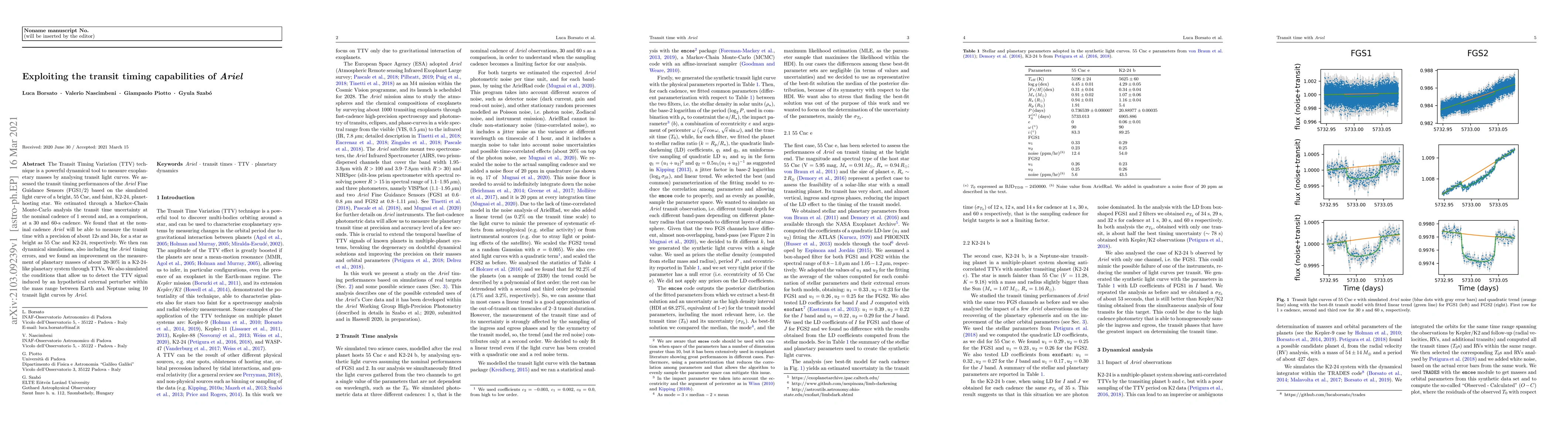 The Transit Timing Variation (TTV) technique is a powerful dynamical tool to measure exoplanetary masses by analysing transit light curves. We assessed the transit timing performances of the Ariel Fine Guidance Sensors (FGS1/2) based on the simulated light curve of a bright, 55 Cnc, and faint, K2-24, planet-hosting star. We estimated through a Markov-Chain Monte-Carlo analysis the transit time uncertainty at the nominal cadence of 1 second and, as a comparison, at a 30 and 60-s cadence. We found that at the nominal cadence Ariel will be able to measure the transit time with a precision of about 12s and 34s, for a star as bright as 55 Cnc and K2-24, respectively. We then ran dynamical simulations, also including the Ariel timing errors, and we found an improvement on the measurement of planetary masses of about $20-30\%$ in a K2-24-like planetary system through TTVs. We also simulated the conditions that allow us to detect the TTV signal induced by an hypothetical external perturber within the mass range between Earth and Neptune using 10 transit light curves by Ariel.