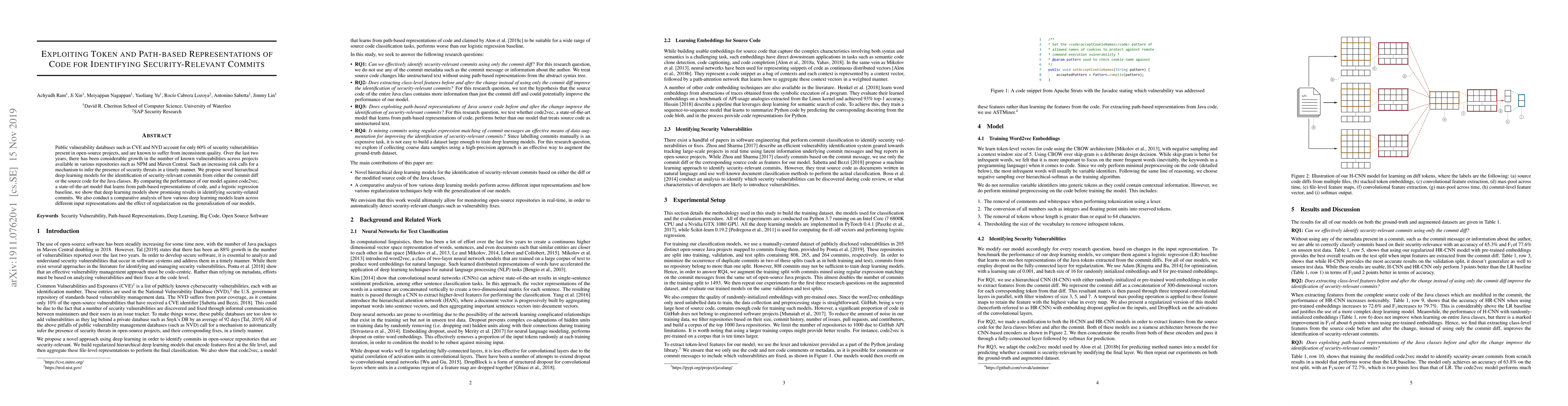 Public vulnerability databases such as CVE and NVD account for only 60% of security vulnerabilities present in open-source projects, and are known to suffer from inconsistent quality. Over the last two years, there has been considerable growth in the number of known vulnerabilities across projects available in various repositories such as NPM and Maven Central. Such an increasing risk calls for a mechanism to infer the presence of security threats in a timely manner. We propose novel hierarchical deep learning models for the identification of security-relevant commits from either the commit diff or the source code for the Java classes. By comparing the performance of our model against code2vec, a state-of-the-art model that learns from path-based representations of code, and a logistic regression baseline, we show that deep learning models show promising results in identifying security-related commits. We also conduct a comparative analysis of how various deep learning models learn across different input representations and the effect of regularization on the generalization of our models.