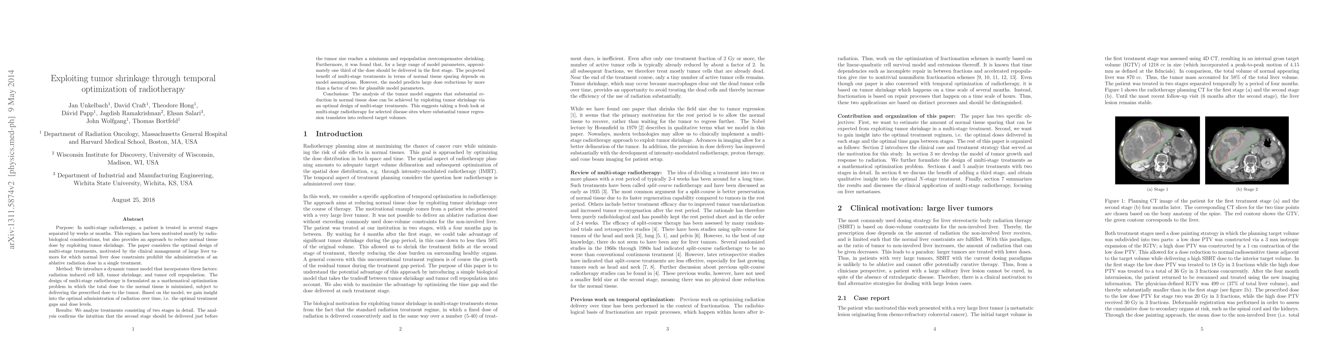 This paper explores the optimal design of multi-stage radiotherapy to exploit tumor shrinkage and reduce normal tissue dose, particularly for large liver tumors. It introduces a dynamic tumor model incorporating cell kill, shrinkage, and repopulation, and finds that optimal treatment gaps and dose levels can significantly reduce liver dose, suggesting a reevaluation of multi-stage radiotherapy for tumors that regress.