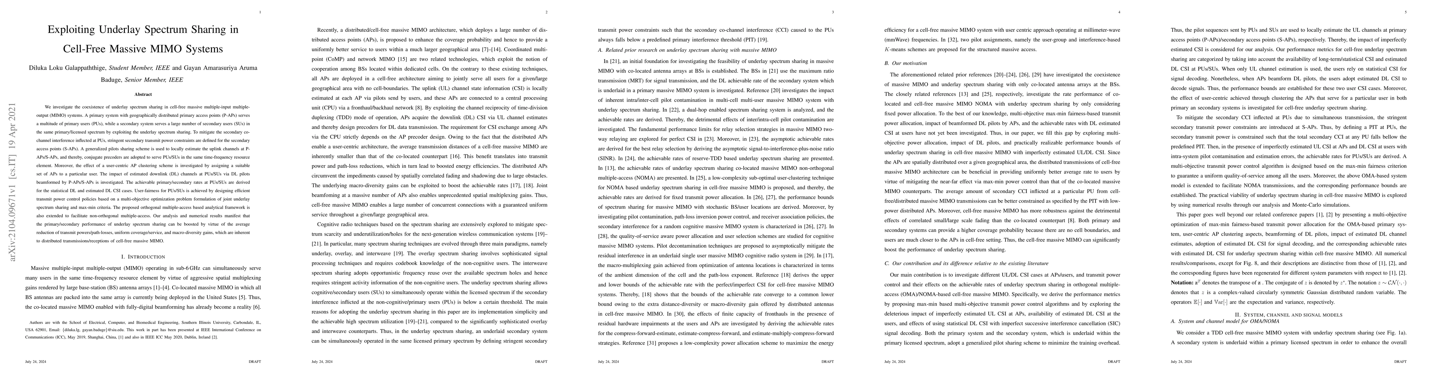This paper explores underlay spectrum sharing in cell-free massive MIMO systems, where primary and secondary users coexist in the same licensed spectrum. The study proposes a power control scheme and pilot sharing method to mitigate interference and enhance performance, demonstrating improved primary/secondary rates and user fairness through analytical and numerical evaluations.