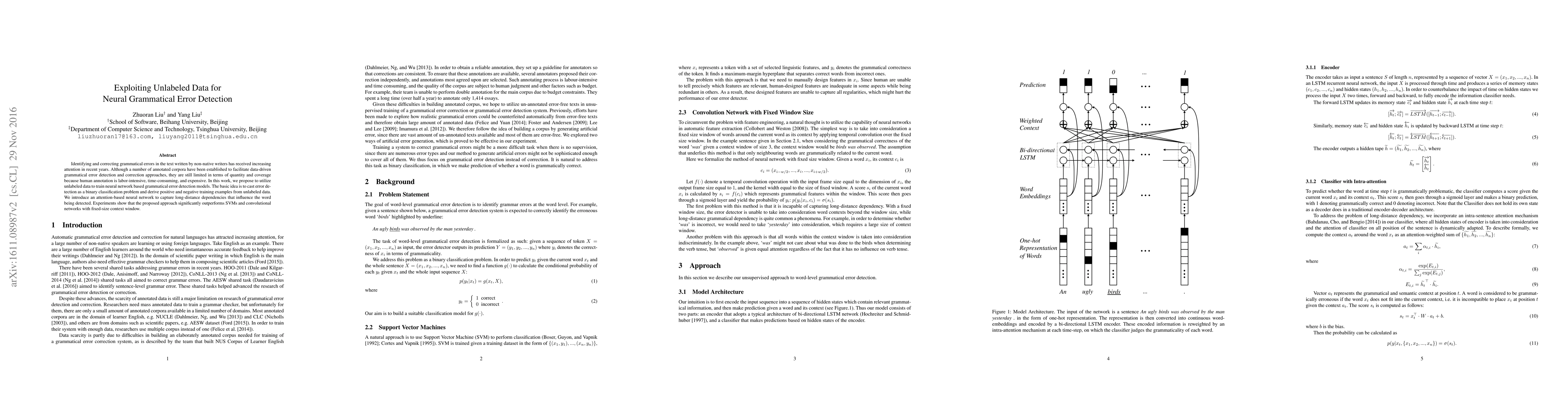 This paper proposes a neural network-based method to detect grammatical errors in non-native text using unlabeled data, framing error detection as a binary classification problem. An attention-based neural network captures long-distance dependencies, outperforming traditional SVMs and convolutional networks.