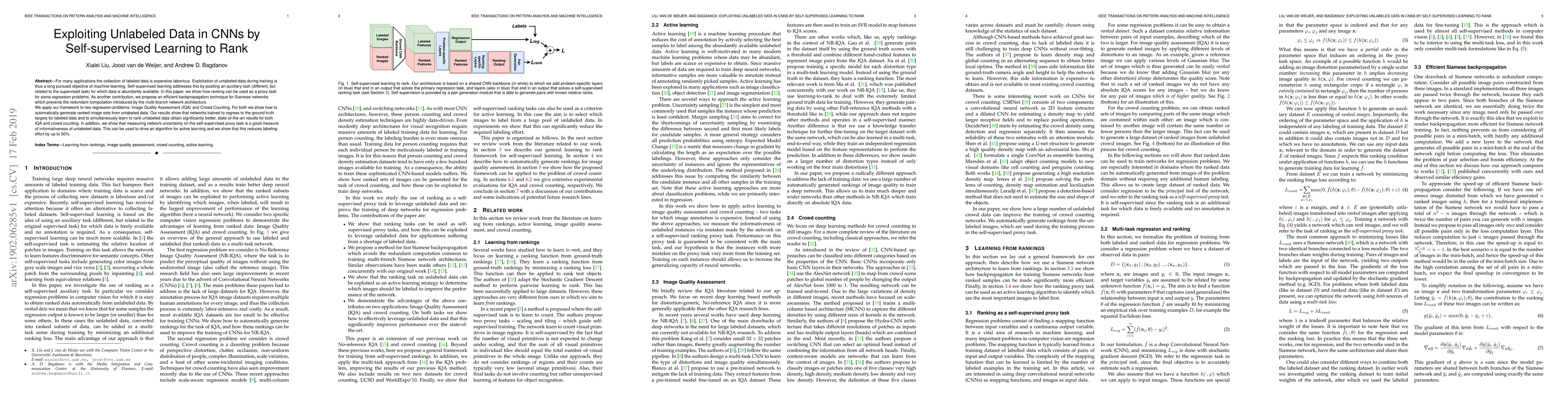 This paper explores self-supervised learning using ranking as a proxy task to leverage unlabeled data for training Convolutional Neural Networks (CNNs) in regression problems, specifically Image Quality Assessment and Crowd Counting. It introduces an efficient backpropagation technique for Siamese networks and demonstrates significant improvements in performance, alongside a method for active learning that reduces labeling effort by up to 50%.