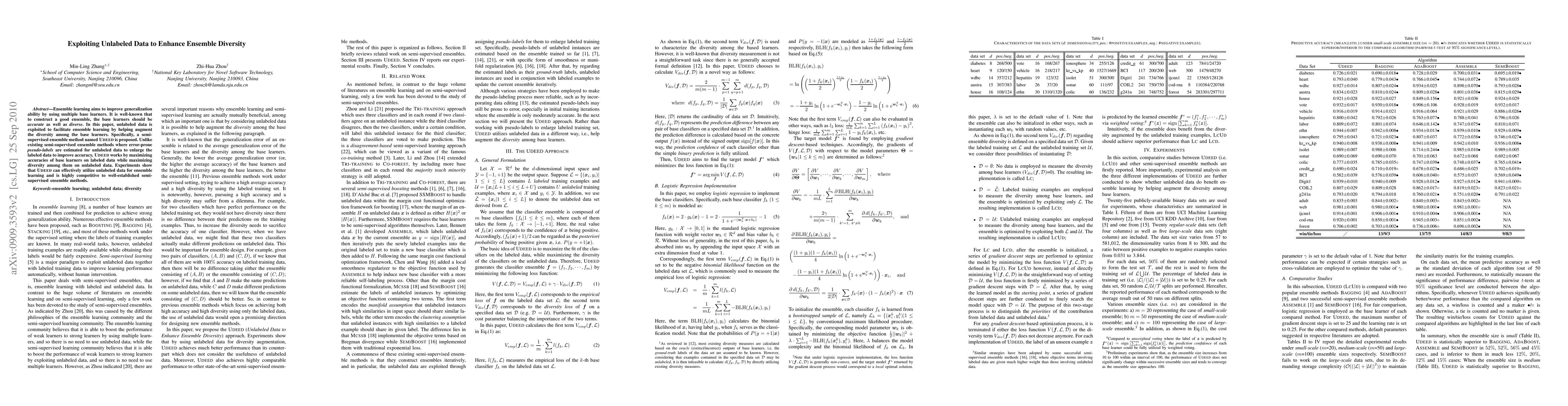 Ensemble learning aims to improve generalization ability by using multiple base learners. It is well-known that to construct a good ensemble, the base learners should be accurate as well as diverse. In this paper, unlabeled data is exploited to facilitate ensemble learning by helping augment the diversity among the base learners. Specifically, a semi-supervised ensemble method named UDEED is proposed. Unlike existing semi-supervised ensemble methods where error-prone pseudo-labels are estimated for unlabeled data to enlarge the labeled data to improve accuracy, UDEED works by maximizing accuracies of base learners on labeled data while maximizing diversity among them on unlabeled data. Experiments show that UDEED can effectively utilize unlabeled data for ensemble learning and is highly competitive to well-established semi-supervised ensemble methods.