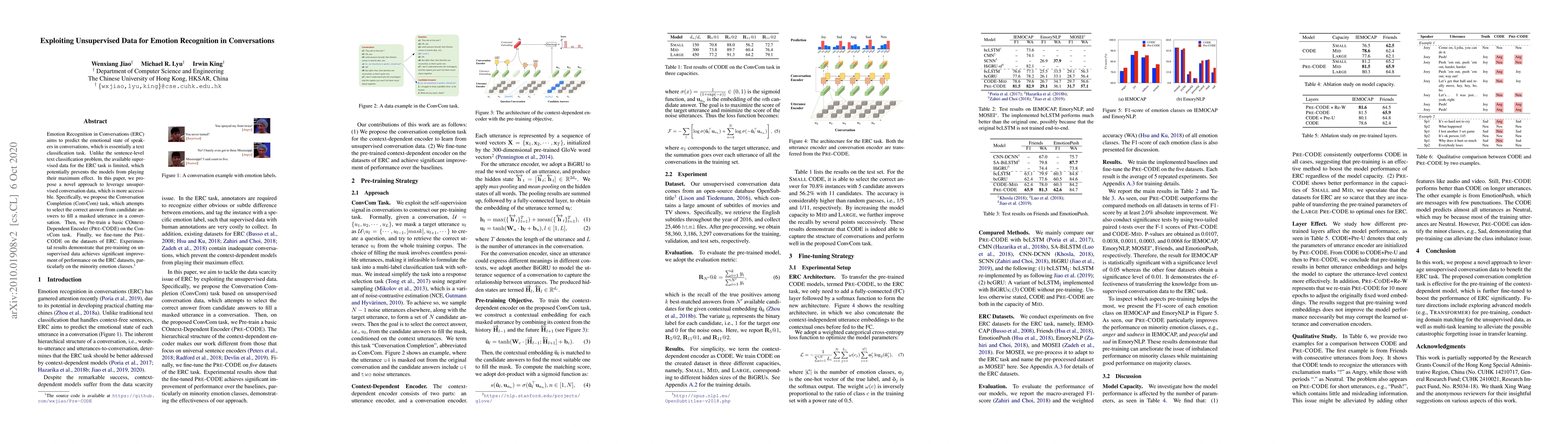 This paper proposes a method to enhance Emotion Recognition in Conversations (ERC) by leveraging unsupervised conversation data through the Conversation Completion (ConvCom) task. Pre-training a COntext-Dependent Encoder (Pre-CODE) on ConvCom and fine-tuning it on ERC datasets significantly improves performance, especially for minority emotion classes.