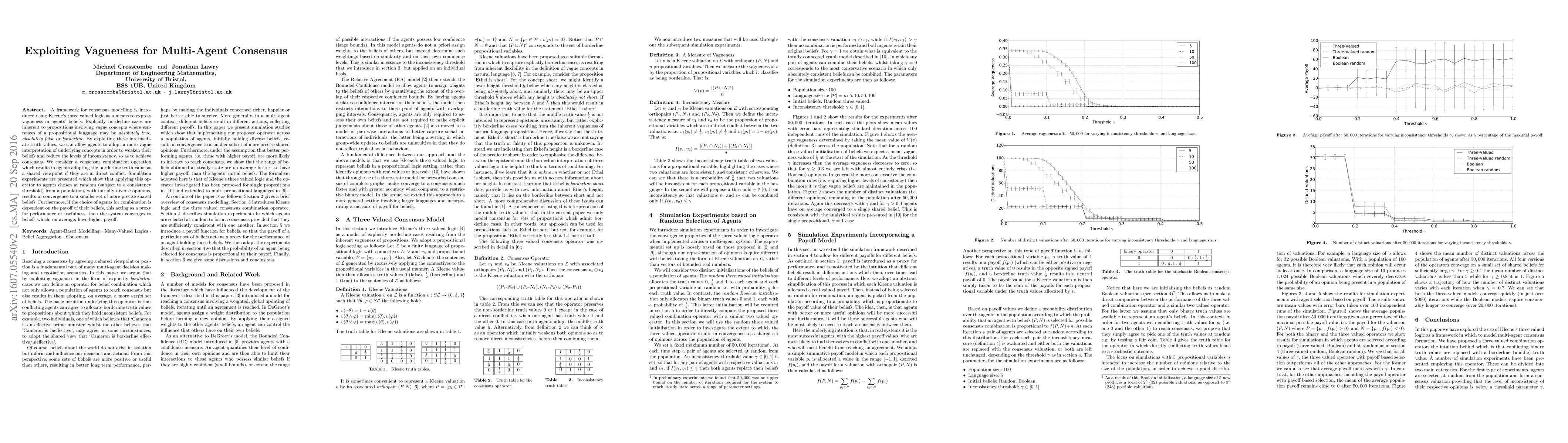 A framework for consensus modelling is introduced using Kleene's three valued logic as a means to express vagueness in agents' beliefs. Explicitly borderline cases are inherent to propositions involving vague concepts where sentences of a propositional language may be absolutely true, absolutely false or borderline. By exploiting these intermediate truth values, we can allow agents to adopt a more vague interpretation of underlying concepts in order to weaken their beliefs and reduce the levels of inconsistency, so as to achieve consensus. We consider a consensus combination operation which results in agents adopting the borderline truth value as a shared viewpoint if they are in direct conflict. Simulation experiments are presented which show that applying this operator to agents chosen at random (subject to a consistency threshold) from a population, with initially diverse opinions, results in convergence to a smaller set of more precise shared beliefs. Furthermore, if the choice of agents for combination is dependent on the payoff of their beliefs, this acting as a proxy for performance or usefulness, then the system converges to beliefs which, on average, have higher payoff.