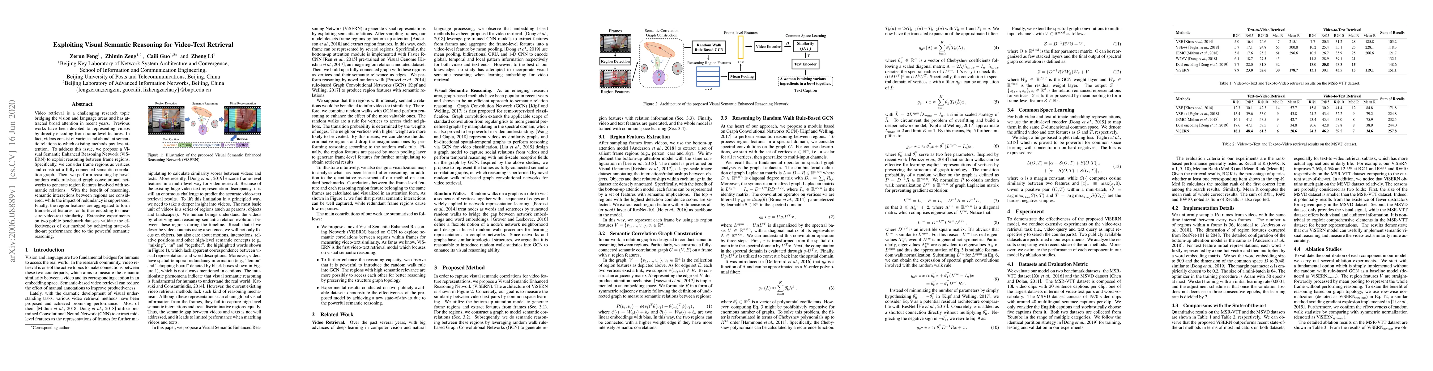 This paper proposes a Visual Semantic Enhanced Reasoning Network (ViSERN) to improve video-text retrieval by leveraging semantic reasoning between frame regions. The method constructs a semantic correlation graph and uses graph convolutional networks with a novel random walk rule to generate region features that incorporate semantic relations, enhancing video representation and achieving state-of-the-art performance on benchmark datasets.