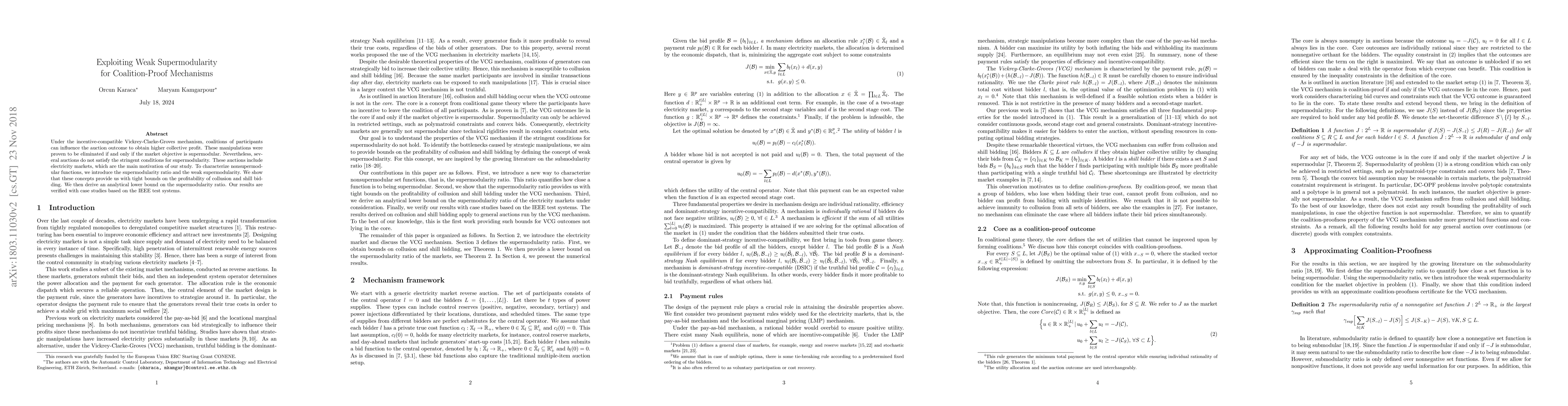 This paper explores coalition-proof mechanisms for auctions where the objective function is not supermodular, focusing on electricity markets. It introduces weak supermodularity and the supermodularity ratio to provide bounds on collusion profitability, deriving an analytical lower bound and validating results with IEEE test systems.
