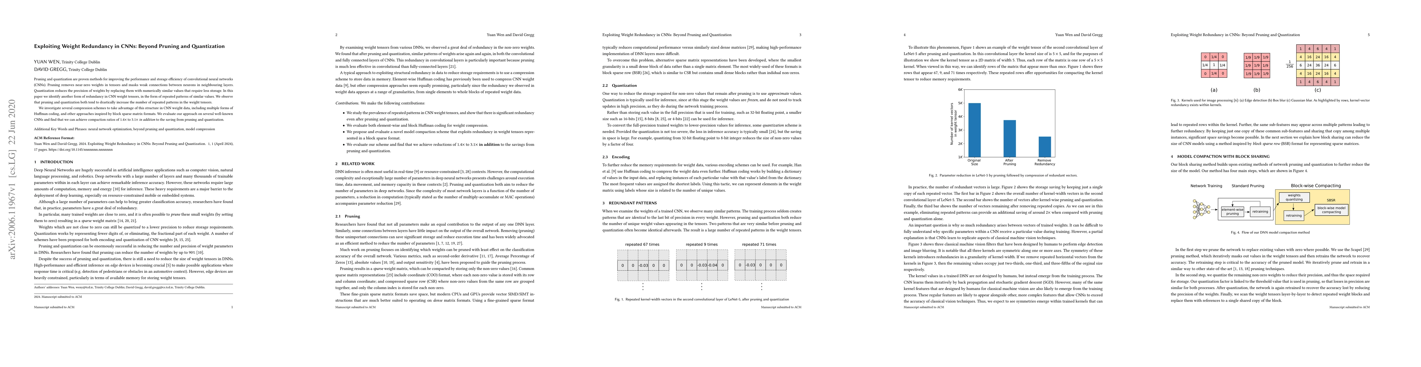 This paper explores exploiting weight redundancy in CNNs through repeated patterns in weight tensors, beyond traditional pruning and quantization. It proposes various compression schemes, including Huffman coding and block sparse matrix formats, achieving significant additional compaction ratios of 1.4x to 3.1x on several CNN models.