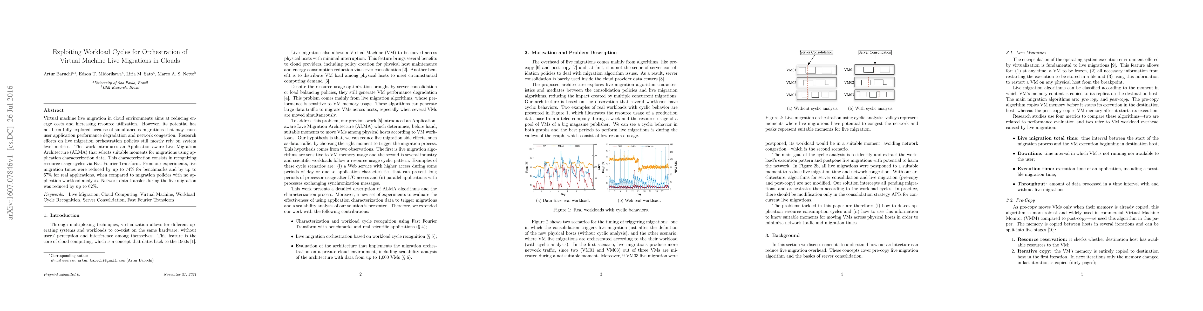 This paper proposes an Application-aware Live Migration Architecture (ALMA) that optimizes virtual machine live migrations in cloud environments by recognizing workload cycles using Fast Fourier Transform, leading to up to 74% reduction in migration times and 62% reduction in network data transfer.