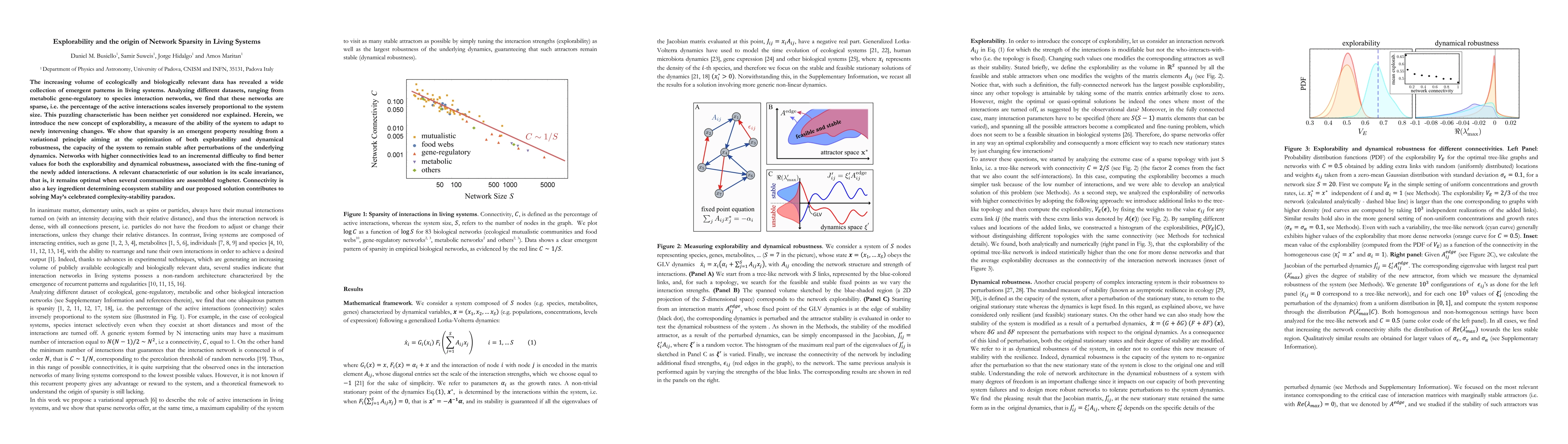 The increasing volume of ecologically and biologically relevant data has revealed a wide collection of emergent patterns in living systems. Analyzing different datasets, ranging from metabolic gene-regulatory to species interaction networks, we find that these networks are sparse, i.e. the percentage of the active interactions scales inversely proportional to the system size. This puzzling characteristic has been neither yet considered nor explained. Herein, we introduce the new concept of explorability, a measure of the ability of the system to adapt to newly intervening changes. We show that sparsity is an emergent property resulting from a variational principle aiming at the optimization of both explorability and dynamical robustness, the capacity of the system to remain stable after perturbations of the underlying dynamics. Networks with higher connectivities lead to an incremental difficulty to find better values for both the explorability and dynamical robustness, associated with the fine-tuning of the newly added interactions. A relevant characteristic of our solution is its scale invariance, that is, it remains optimal when several communities are assembled togheter. Connectivity is also a key ingredient determining ecosystem stability and our proposed solution contributes to solving May's celebrated complexity-stability paradox.