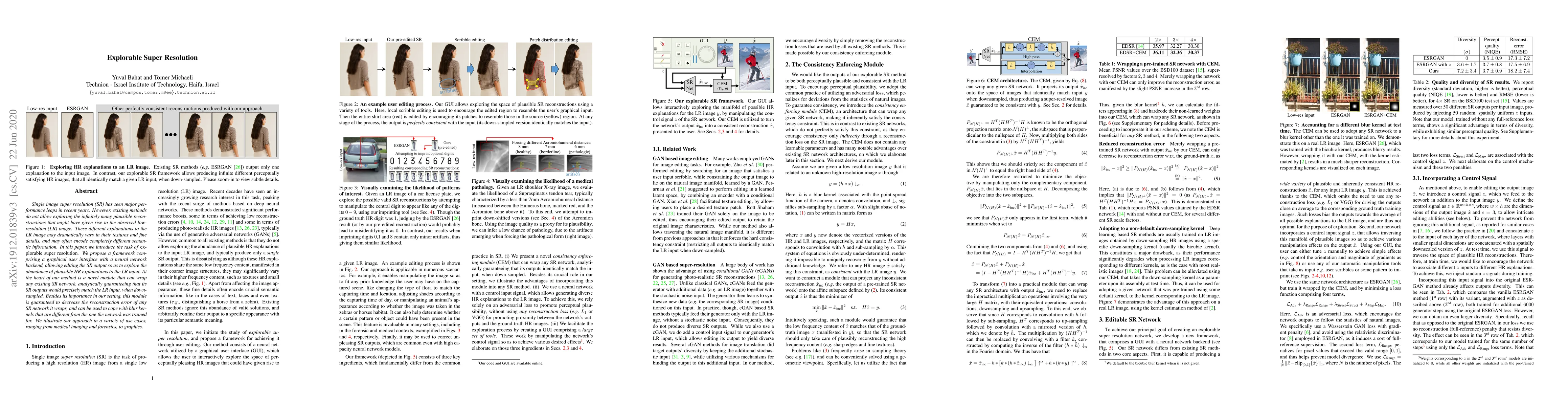 This paper introduces explorable super resolution, a framework that allows users to explore multiple plausible high-resolution reconstructions from a single low-resolution image. The proposed method includes a neural network module that guarantees SR outputs match the original LR input when downsampled, enhancing reconstruction accuracy and flexibility.