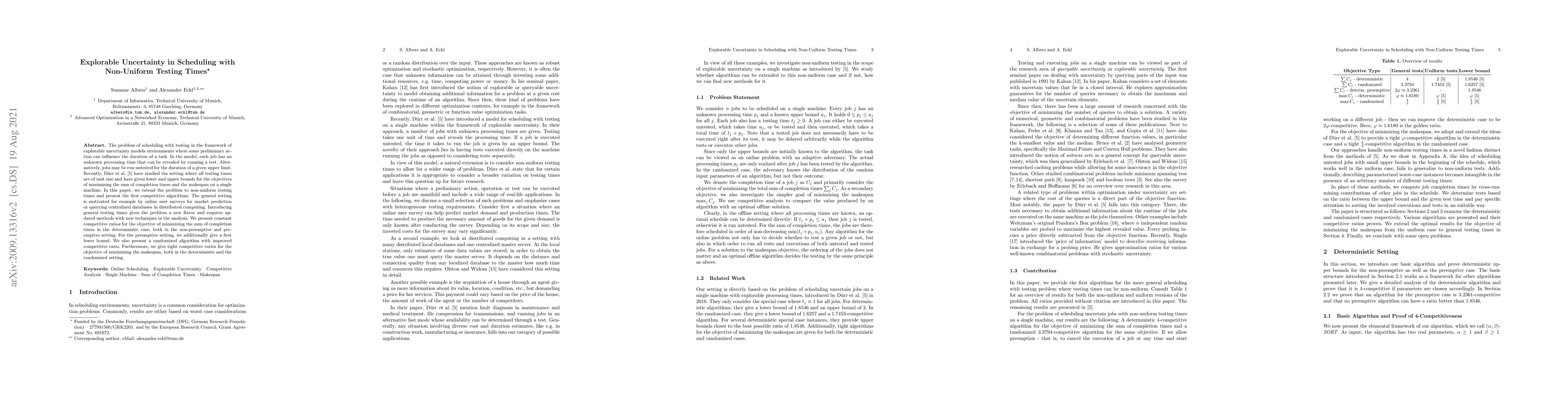 This paper explores scheduling problems in environments with explorable uncertainty, where preliminary tests can influence task durations. It extends previous research on uniform testing times to non-uniform cases, presenting competitive algorithms and competitive ratios for minimizing both the sum of completion times and the makespan.