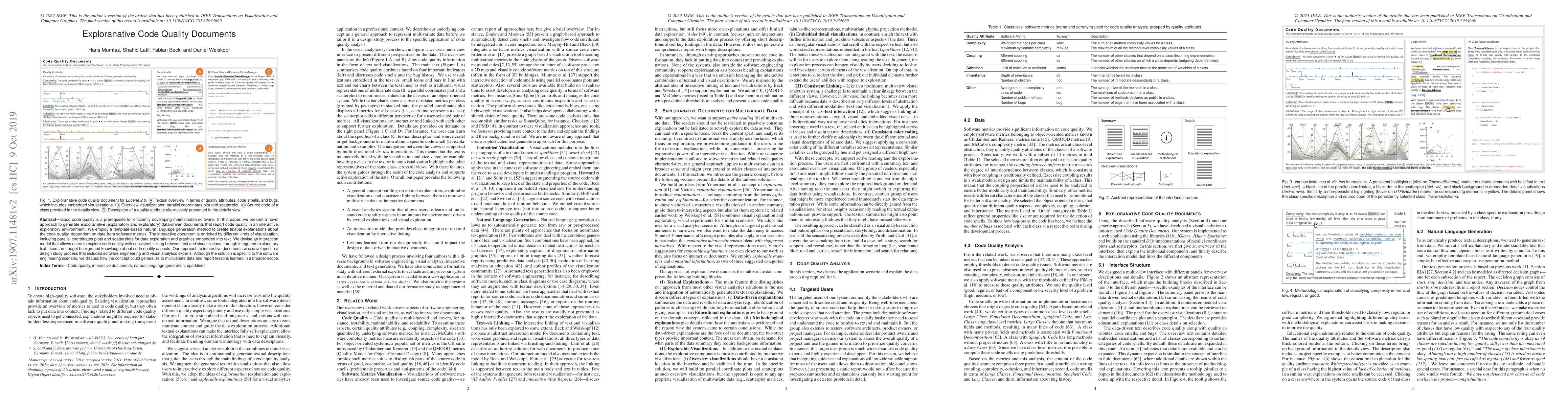 This paper introduces a novel method for generating exploranative documents that report code quality using data-driven, interactive visualizations and explanatory text. The approach combines software metrics with natural language generation to provide users with an interactive environment to explore code quality, linking explanatory text with visualizations to enhance understanding.