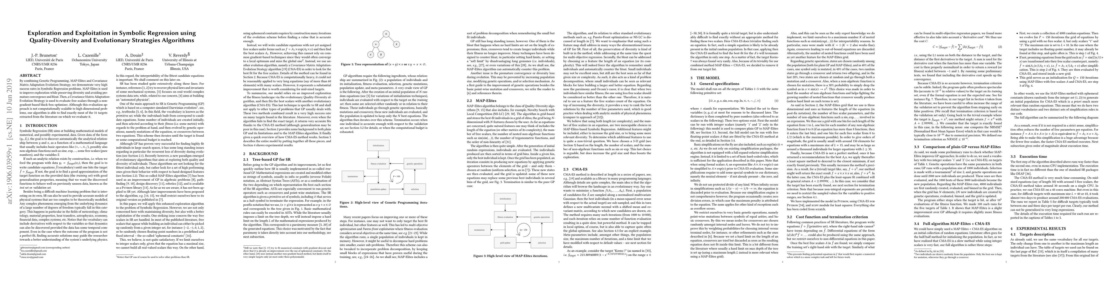 This research paper combines Genetic Programming, MAP-Elites, and Covariance Matrix Adaptation Evolution Strategy to achieve high success rates in Symbolic Regression. MAP-Elites enhances exploration and diversity, while the Covariance Matrix Adaptation-Evolution Strategy optimizes free scalars, successfully finding most targets in evaluated problems.