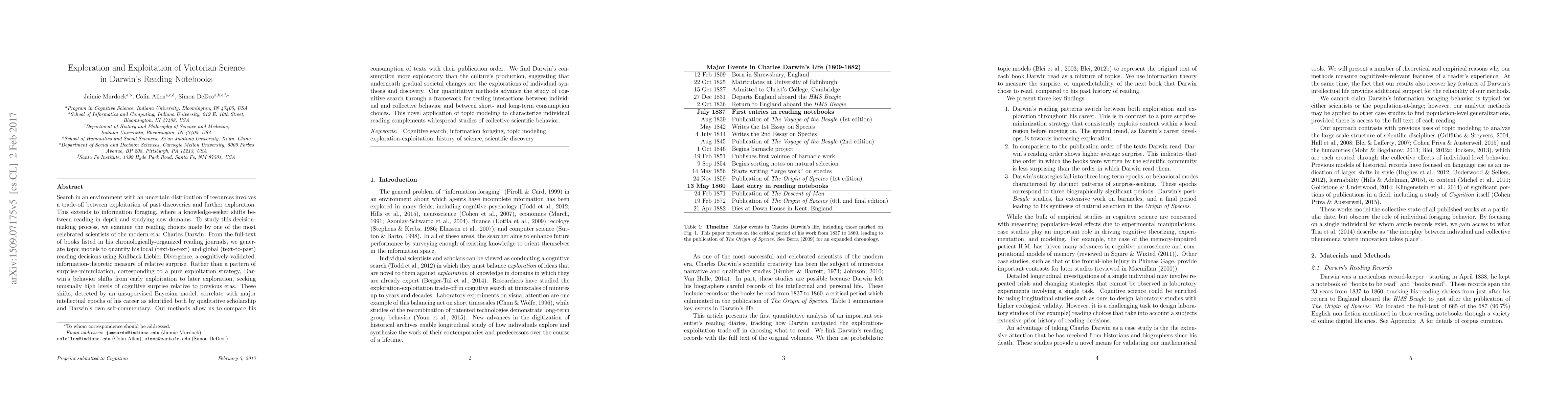 Search in an environment with an uncertain distribution of resources involves a trade-off between exploitation of past discoveries and further exploration. This extends to information foraging, where a knowledge-seeker shifts between reading in depth and studying new domains. To study this decision-making process, we examine the reading choices made by one of the most celebrated scientists of the modern era: Charles Darwin. From the full-text of books listed in his chronologically-organized reading journals, we generate topic models to quantify his local (text-to-text) and global (text-to-past) reading decisions using Kullback-Liebler Divergence, a cognitively-validated, information-theoretic measure of relative surprise. Rather than a pattern of surprise-minimization, corresponding to a pure exploitation strategy, Darwin's behavior shifts from early exploitation to later exploration, seeking unusually high levels of cognitive surprise relative to previous eras. These shifts, detected by an unsupervised Bayesian model, correlate with major intellectual epochs of his career as identified both by qualitative scholarship and Darwin's own self-commentary. Our methods allow us to compare his consumption of texts with their publication order. We find Darwin's consumption more exploratory than the culture's production, suggesting that underneath gradual societal changes are the explorations of individual synthesis and discovery. Our quantitative methods advance the study of cognitive search through a framework for testing interactions between individual and collective behavior and between short- and long-term consumption choices. This novel application of topic modeling to characterize individual reading complements widespread studies of collective scientific behavior.