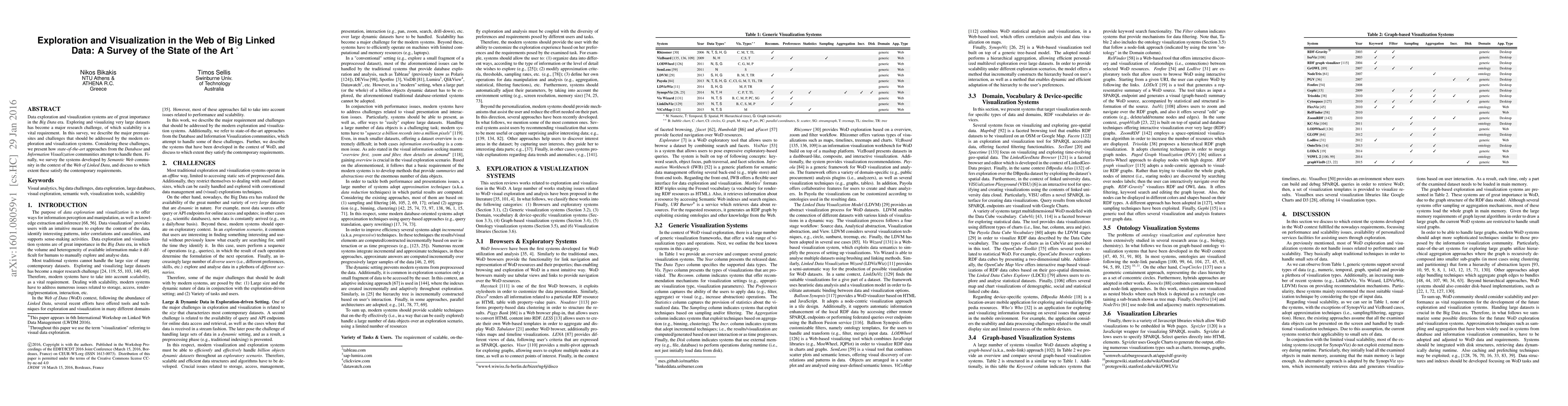 This paper surveys modern exploration and visualization systems for large datasets, highlighting the challenges of scalability and the state-of-the-art solutions from Database and Information Visualization communities. It also examines systems developed for the Web of Linked Data, assessing their effectiveness in meeting current requirements.