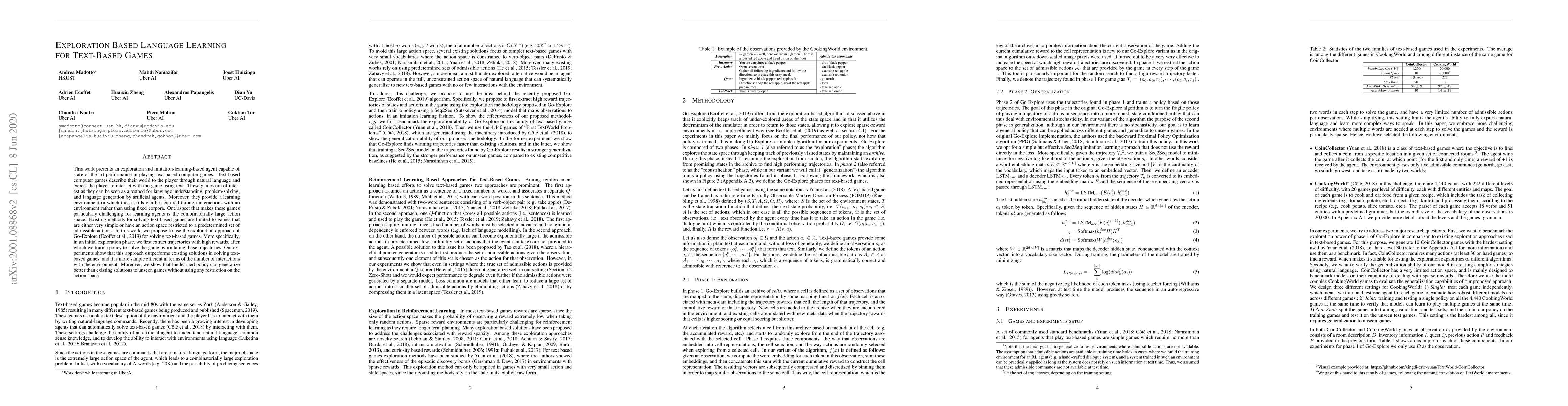 This paper introduces an exploration and imitation-learning-based agent that achieves state-of-the-art performance in text-based games by extracting high-reward trajectories during exploration and training a policy through imitation. The approach outperforms existing methods and is more sample efficient and generalizable.
