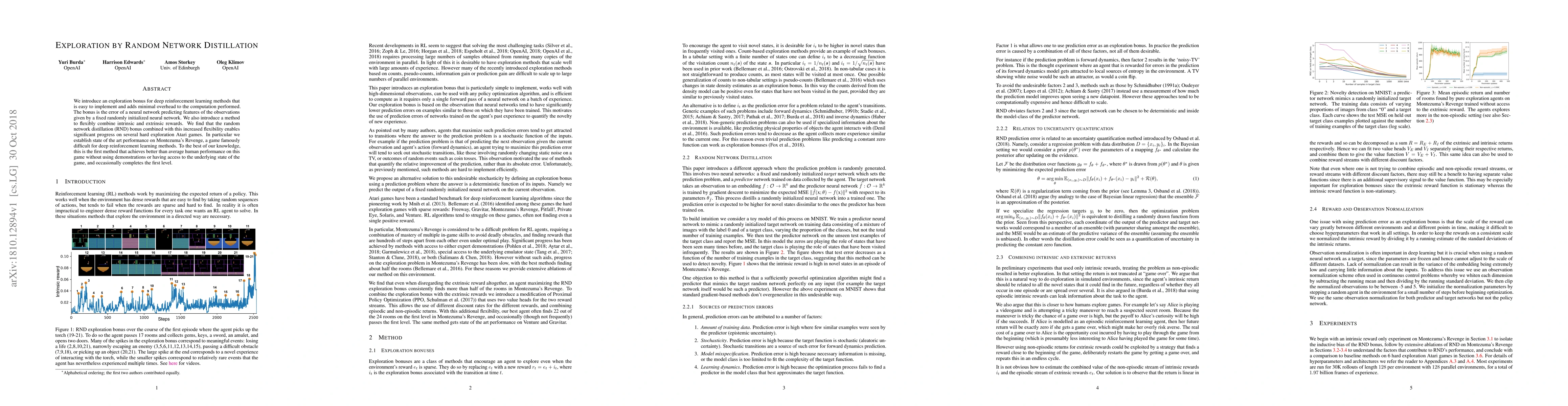 A new method called Random Network Distillation improves exploration in deep reinforcement learning by adding a bonus that encourages agents to learn from their environment. This approach achieves state-of-the-art performance on a notoriously difficult Atari game without requiring demonstrations or access to the game's state.